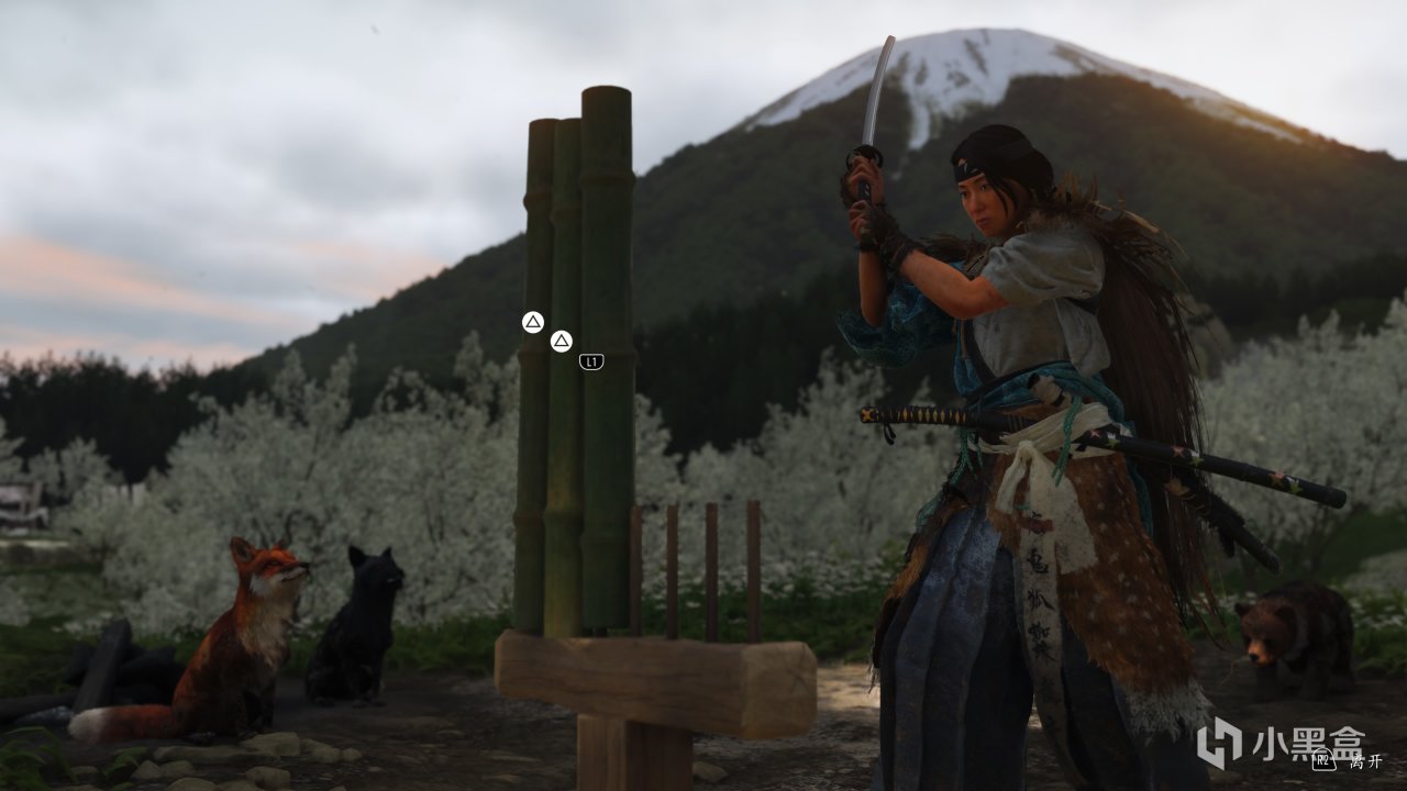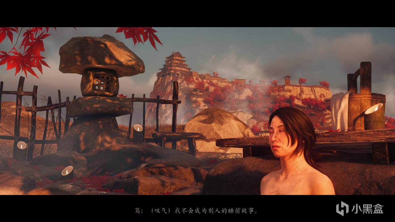 再然後就是數值提升相關的砍竹子和泡溫泉了,砍竹子體驗還不錯,非常考驗手速,而泡溫泉單純就是......播一段篤進溫泉的動畫——選一個問題“反思”一下——結束,這兩個玩法都是一脈相承自前作《對馬島》,但在筆者的實際體驗中,泡溫泉的動畫着實有點墨跡了,但又無法跳過。