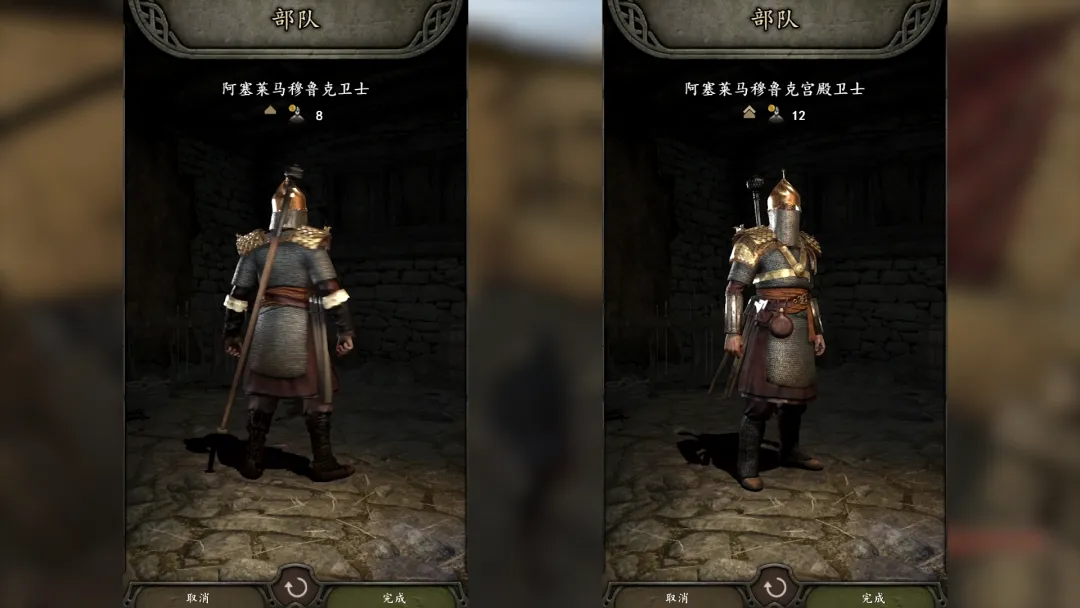 新增了俩件装备阿塞莱南方双手杖和巴旦尼亚战镰。士兵装备迎来改动,阿塞莱马穆鲁克卫士和宫殿卫士的双手武器都改为了南方双手杖,巴旦尼亚资深镰兵替换武器为长战镰。