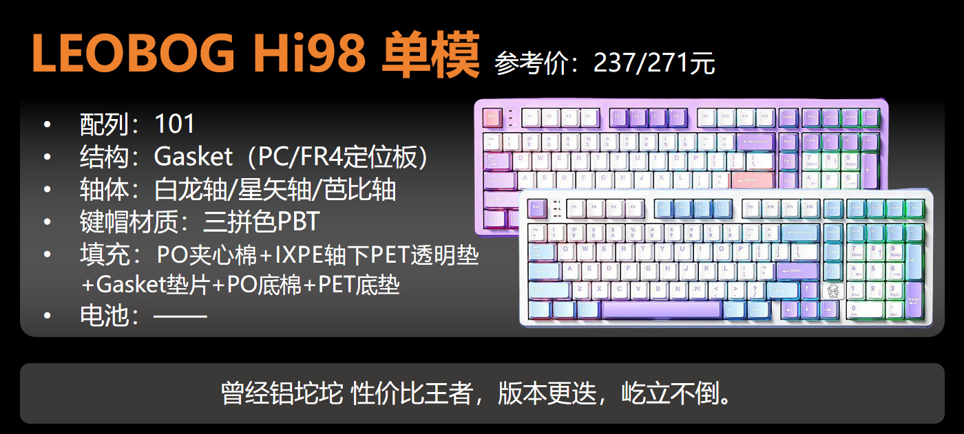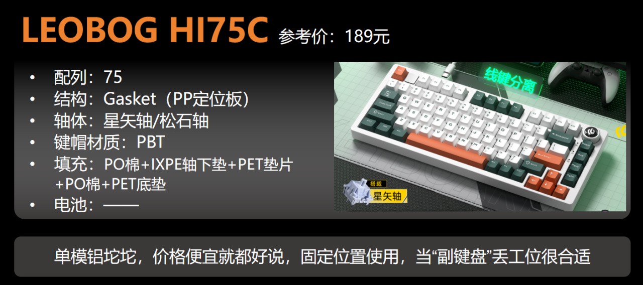 LEOBOG HI75C,本来我是不太想提这款的,但毕竟99块钱就能买到铝坨坨套件,这性价比确实没话说。