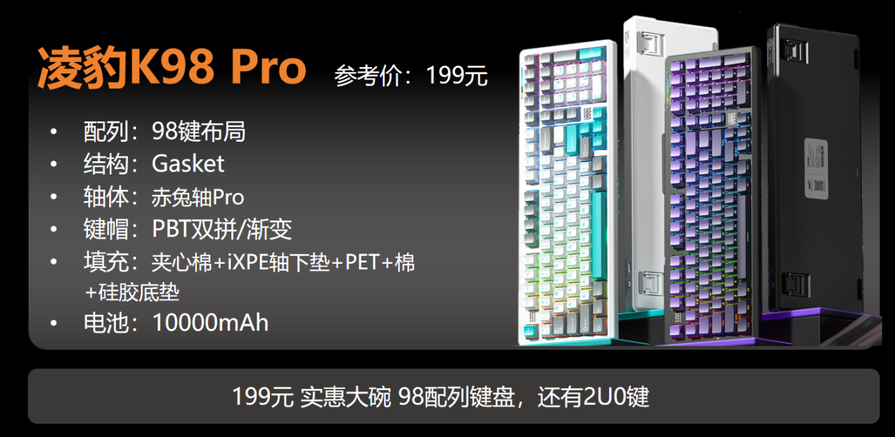 当然,189元的晴山蓝配色+赤兔轴PRO版本也很强。如果你还没有机械键盘,预算就200块左右,对做工要求没啥要求,想买一把靠谱的、把钱花在刀刃上的入门键盘,那选K98绝对不会错。
