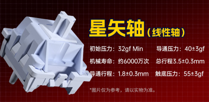 轴体搭载的是星矢轴,触发压力为40克,导通行程为1.8mm没有灰木轴那么轻盈,手感会偏实在,硬一点,合适带耳机干活用的轴体。这个轴手感算是比较在线的。