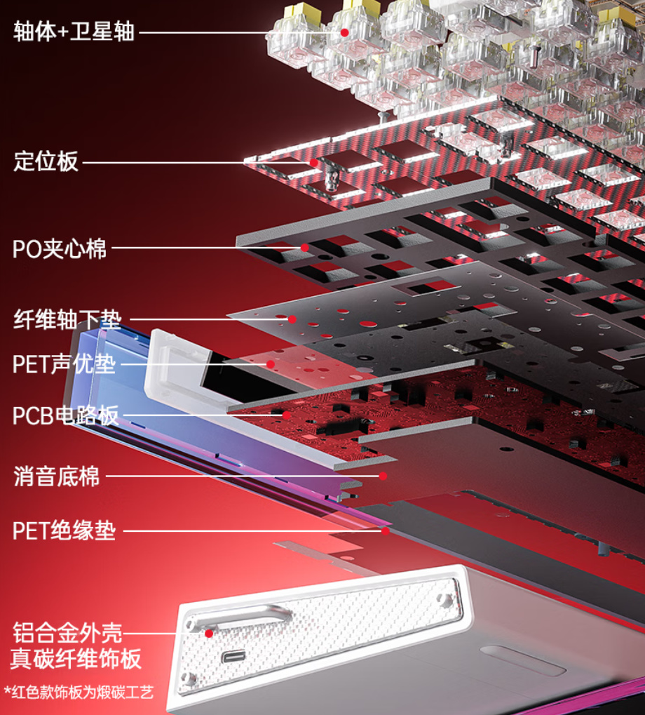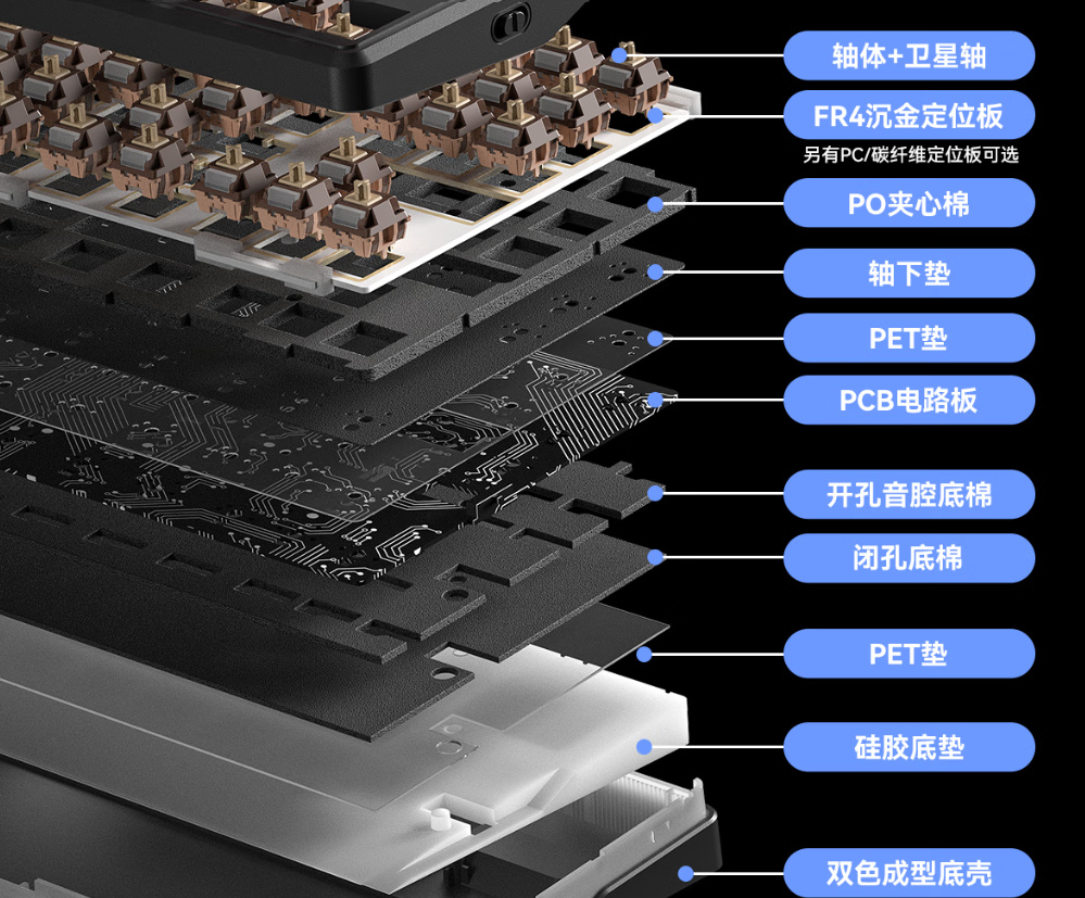 填充:Poron夹心棉+减震棉条+PET声优垫+IXPE轴下垫+轴座棉+吸音底棉