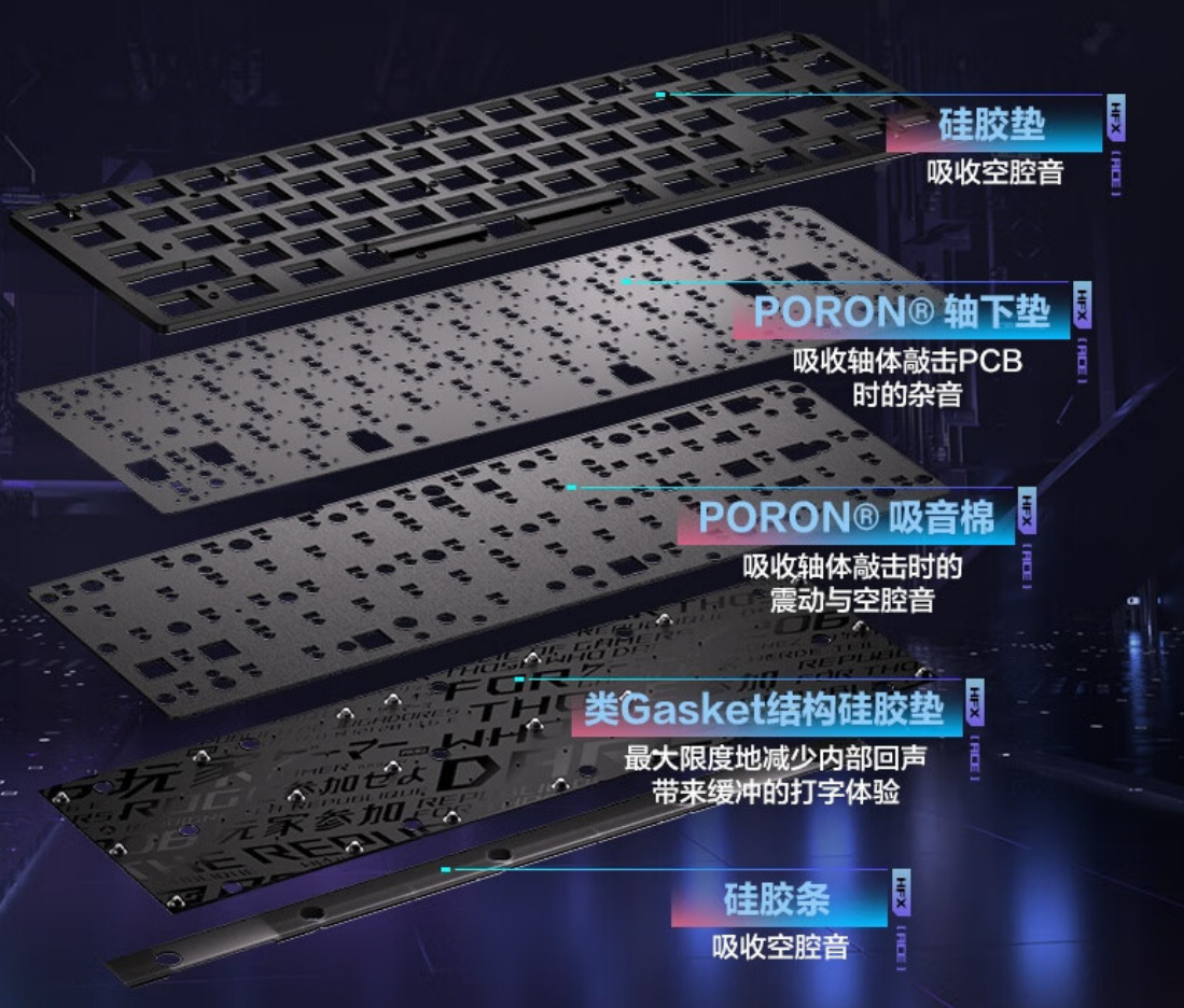 甚至这个键盘还做了5层填充,硅胶垫+Poron轴下垫+Poron吸音棉+硅胶底垫+硅胶条,这算是象征ROG正式加入客制化队伍。