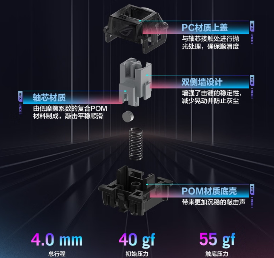 轴体采用ROG HFX磁轴,瑞翼鲨代工,初始压力40gf,触底压力55gf。POM轴心+PC上盖。回弹有力,打字也可以用。
