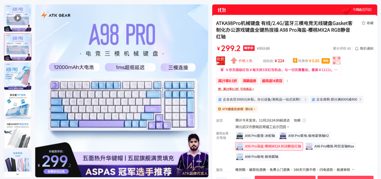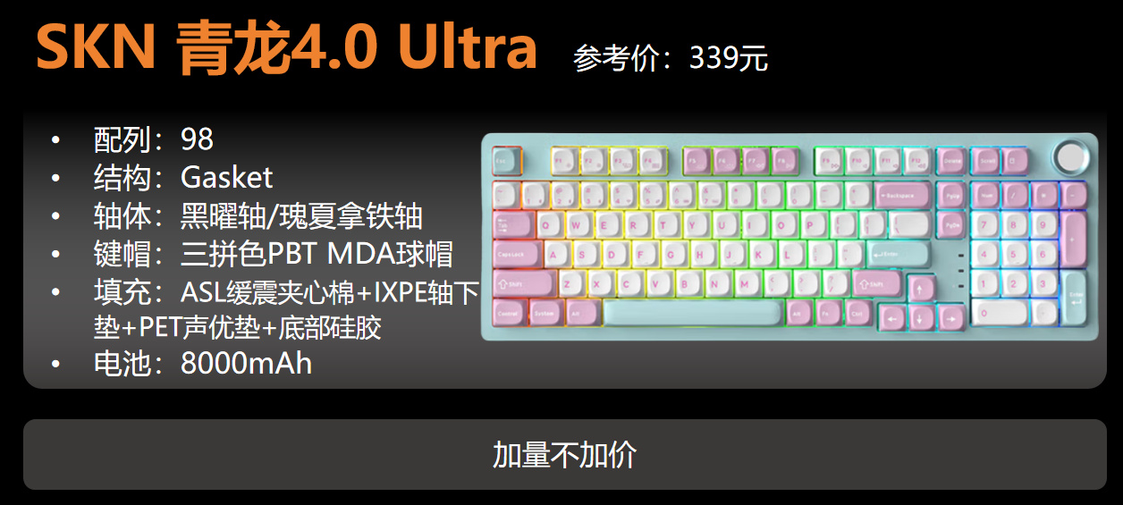 如果你觉得这配置还不够顶,加40块钱就能升级到1万毫安电池,并且轴体也升级为赤兔轴PRO版,还换成了白色外壳。电池直接翻倍,轴体也更强,这40块钱加得非常值。
