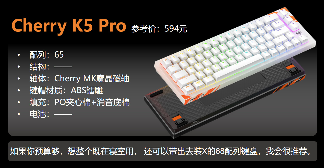 K5 Pro是Cherry磁轴技术下沉的标杆之作,平衡了性能、设计与价格,适合追求轻量化、高颜值且预算有限的玩家,不过,作为老Cherry粉体验新磁轴的承接是没问题的。