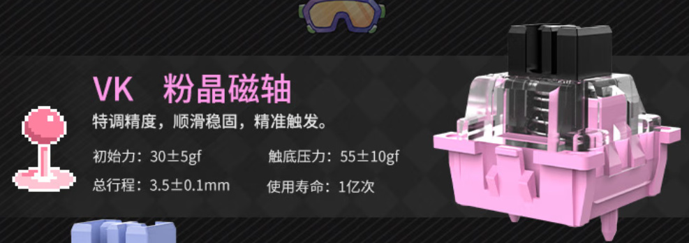 126元,你能得到的是VK晶粉磁轴,支持0.01mm的触发精度,RT调节范围从0.01mm到3.5mm,还支持8KHz回报率和32K扫描率,也兼容混轴玩法。