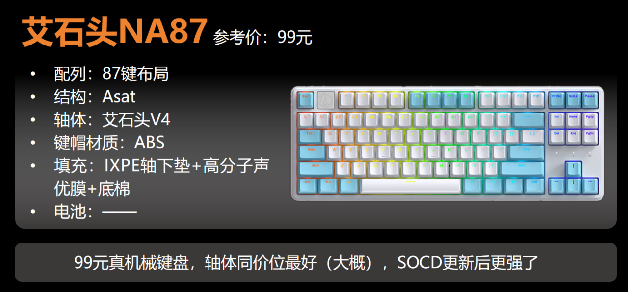 确实,这把键盘我们推荐了很久,这次依然得推荐——毕竟现在真没几家厂商愿意做99块的键盘了,根本不赚钱,卖一百把可能还不如人家高端键盘卖一把的利润。
