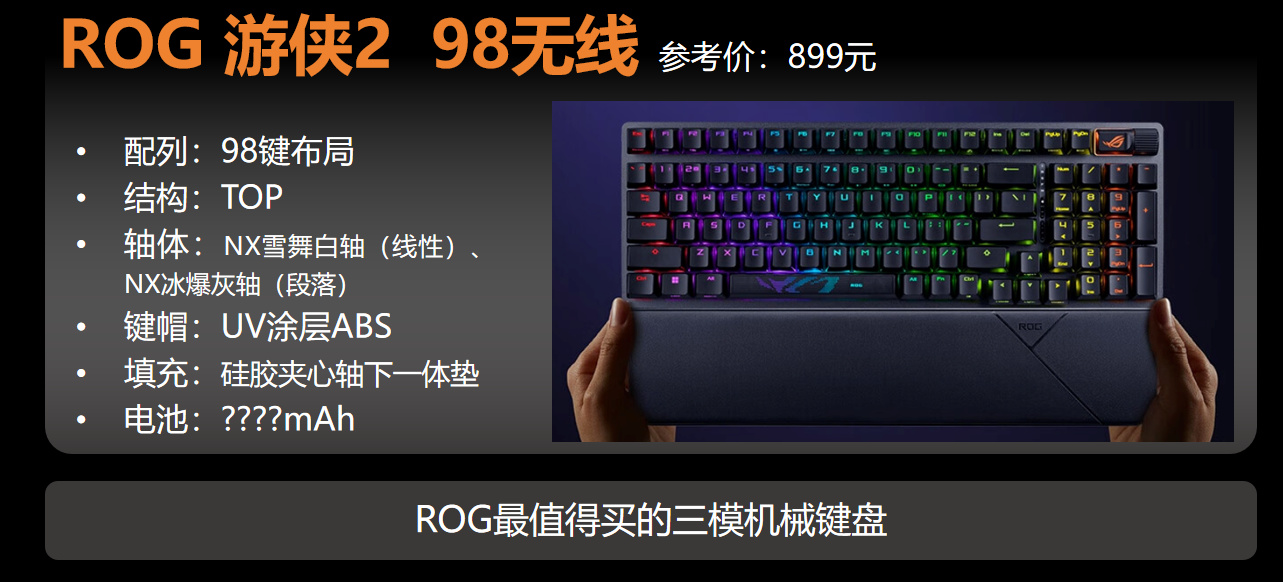 ROG 游侠2 98无线的是ROG最值得买的三模机械键盘。如果你需要更偏游戏偏竞技的体验,可以考虑一下光轴版本。