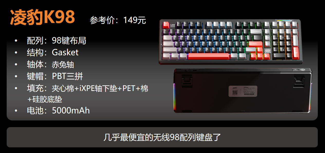 凌豹K98的低配版,确实是150元以内的爆品,基本找不到什么对手。你甚至在“黄鱼”上还能找到100出头的价格,想要全新的也可以在狗东领100减15的券,能做到134元。