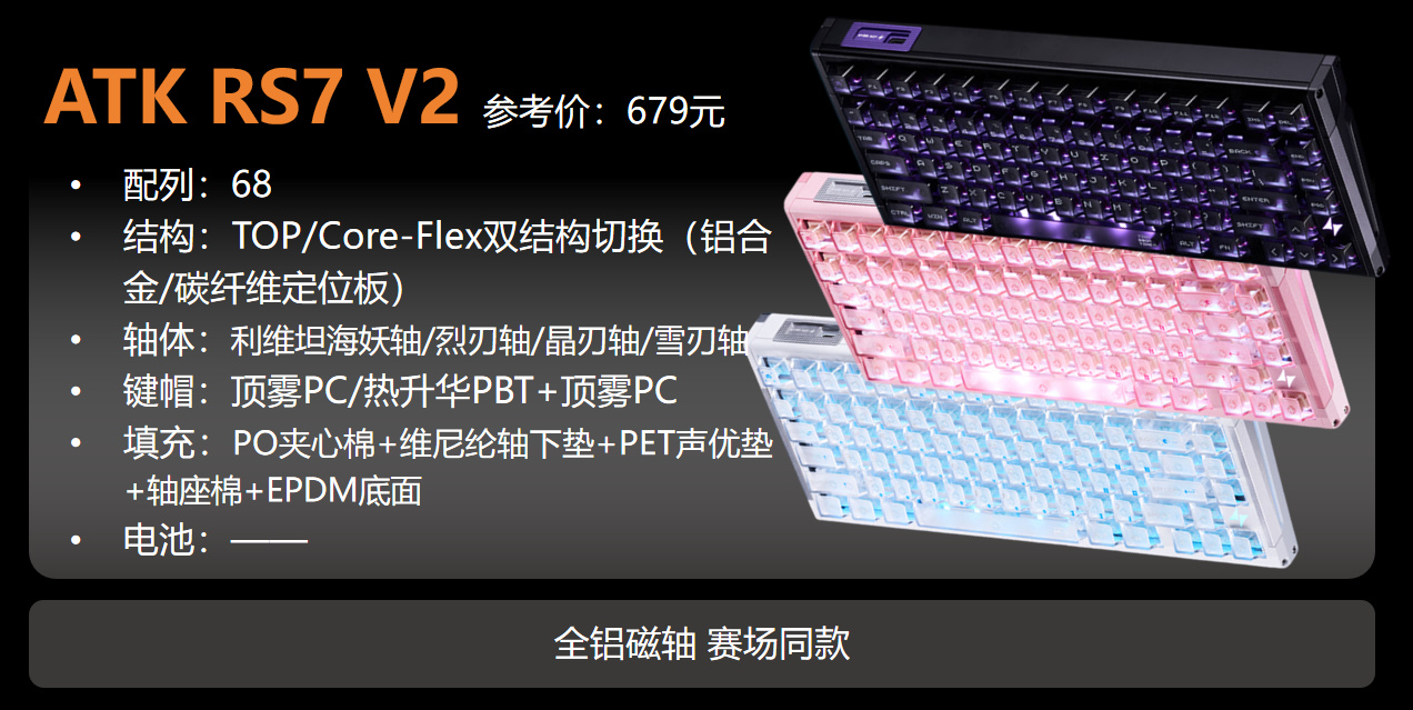 轴体方面有磁玉轴PRO和万磁王RGB可选,都是顶级磁轴,如果可能的话,建议上万磁王版本。配色推荐爱丽儿和极光,比较耐看,女生也可以选早樱。