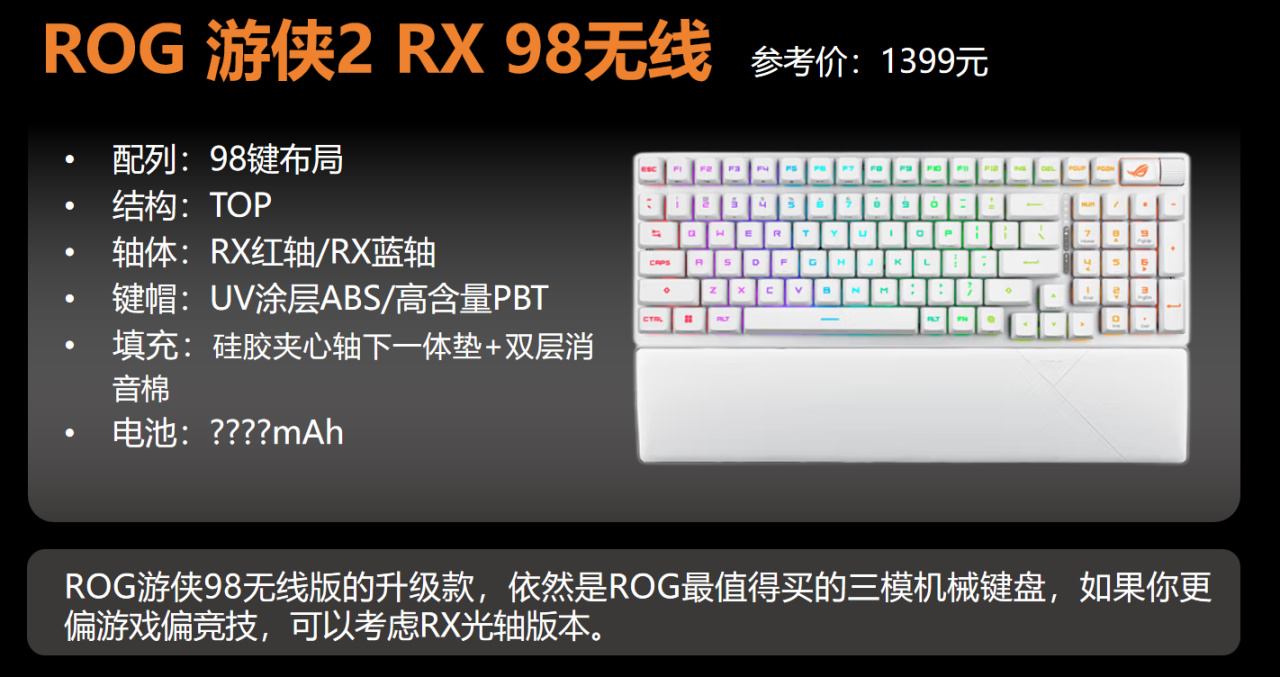 这个是之前ROG游侠98无线版的升级款,三模连接+98配列+Omni双设备连接+多功能三方向旋钮+ROG PBT键帽(懂不懂一套249元键帽的含金量?)+自带掌托,细节都考虑到位了,而且搭载ROG定制 RX光轴,线性的RX红轴和段落的RX蓝轴。手感都极其接近机械轴。
