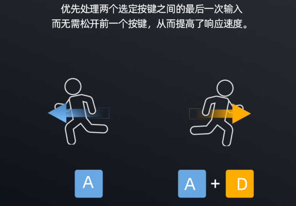 还有一个有意思的功能Speed Tap,开启后同时按下两个按键会先输入后者,并自动释放前者。尤其是身体无法跟上大脑思考的情况下,键盘会帮你执行释放键盘的操作,其实就是SOCD功能。