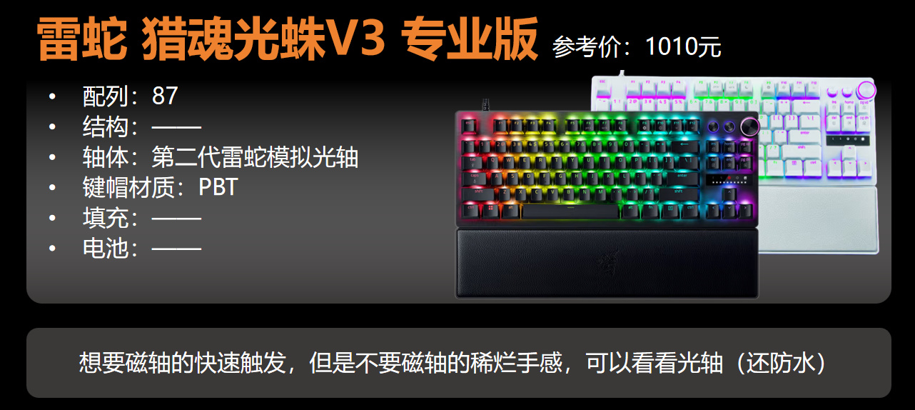 光轴作为一种独立于磁轴和传统机械轴的轴体,其实一直都有,只是不怎么出名,所以也没什么厂商愿意做。雷蛇算是很有心了,一直在坚持更新这个系列,最近还推出了猎魂光蛛V3 Pro的8K版本。