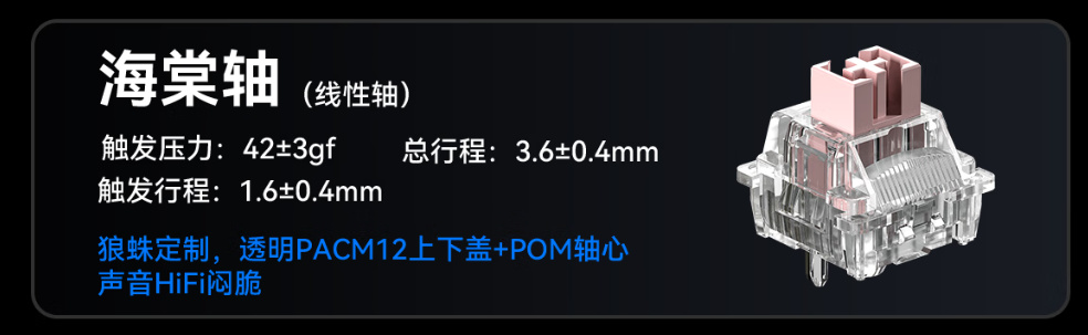 更换为Cherry的新MK魔晶磁轴,38g触发力度,支持0.01mm精度调节,寿命达1亿次,采用MX轴桶装弹簧结构,减少钢丝音和磨损。