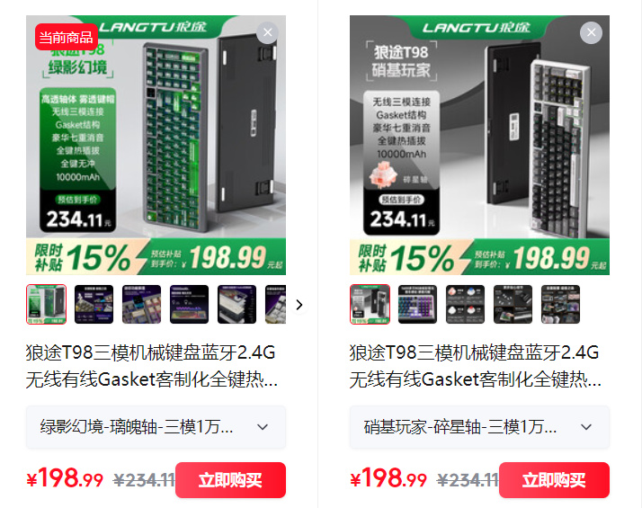 当然,如果你确实需要无线,加40块钱就能升级三模香草冰版本。轴体依然是星矢轴,键帽换成侧刻渐变,其他配置保持不变,支持蓝牙,2.4G,有线三模连接。这40块,加得也值。