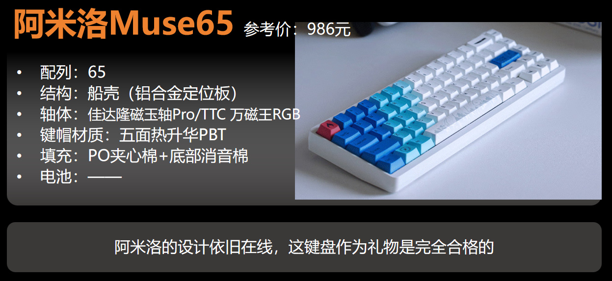 现在价格降到986元,颜值依然在线,尤其是阿米洛的几款主题配色非常出彩,搭配五面热升华工艺的键帽,共有五款主题:极光、阿斯加德、山巅、早樱、爱丽儿等。