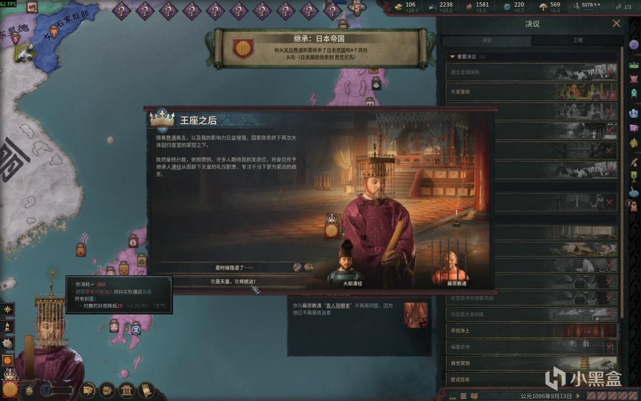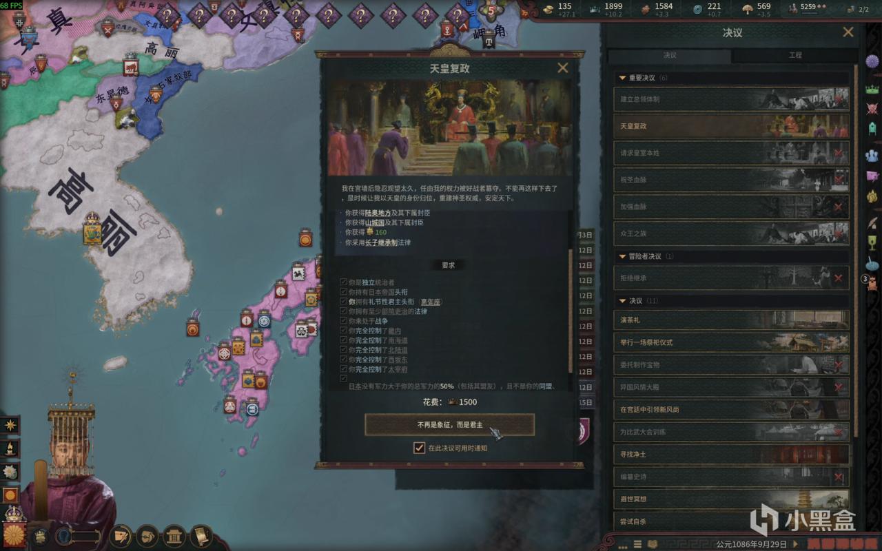 還有天皇復政這個決議條件,你只需要跟着我的思路走就行,別傻乎乎的自己獨立,又或者去攻打一些公國地盤。這些都不需要,你只需要成爲帝國的第一順位繼承人,然後廢黜關白,自己上位就可以完成所有決議條件。威望也夠因爲開局是走的外交中線。