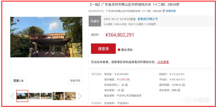 这场拍卖早早就有热度,毕竟它 8 月在二手房市场挂价 5.2 亿元,这次起拍价才 2.15 亿元,价差超 3 亿元,说是 “捡漏价” 一点不夸张。最终 18 万人次围观,6 位买家展开争夺,单次加价都在百万级别。