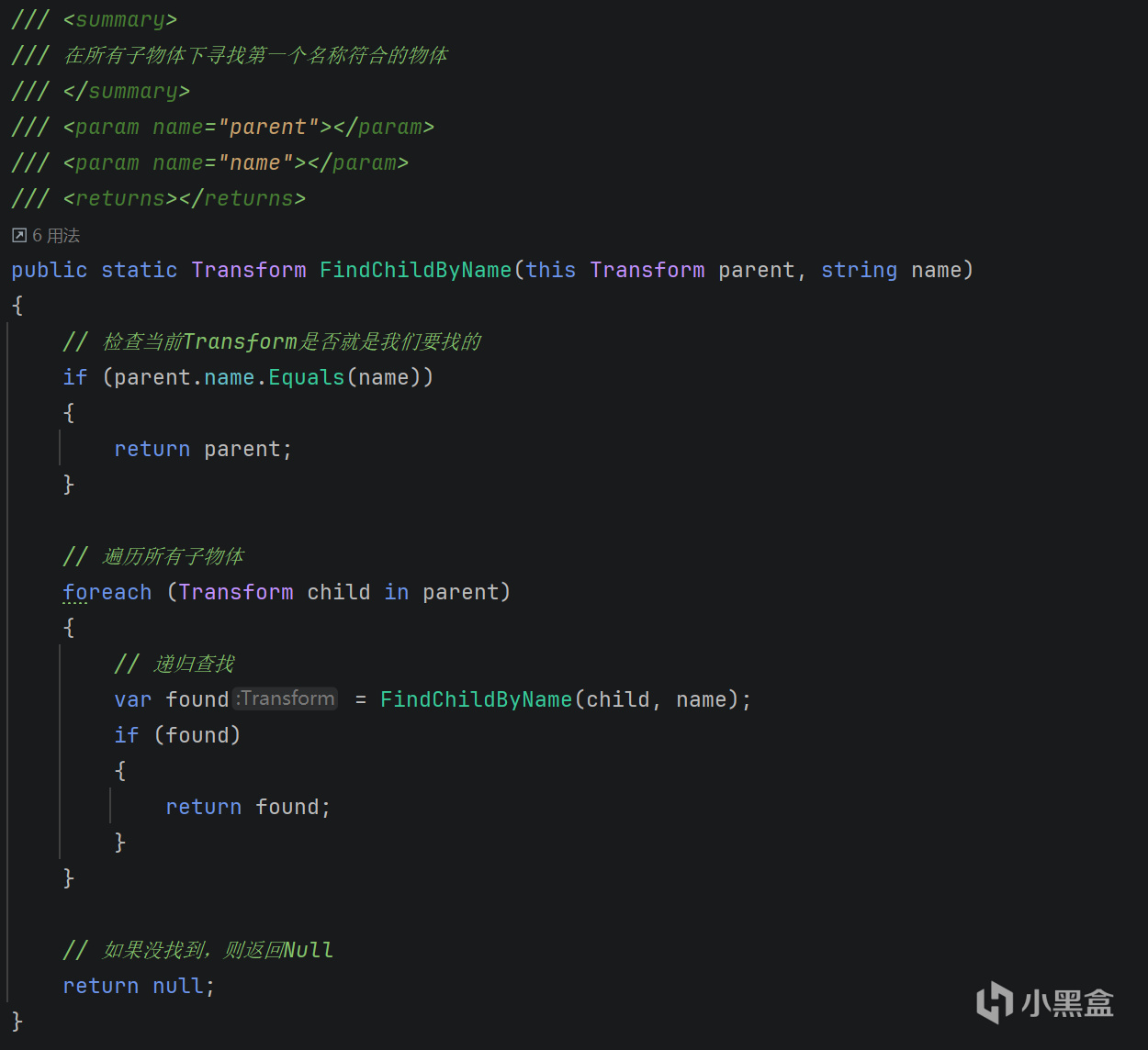 下面这种扩展方法(如果对C#的“拓展方法”概念不熟悉,可以去搜索下),能让你查找一个Transform下面所有的子物体,无论藏得多深: