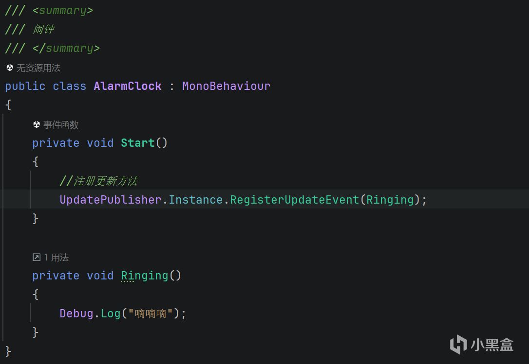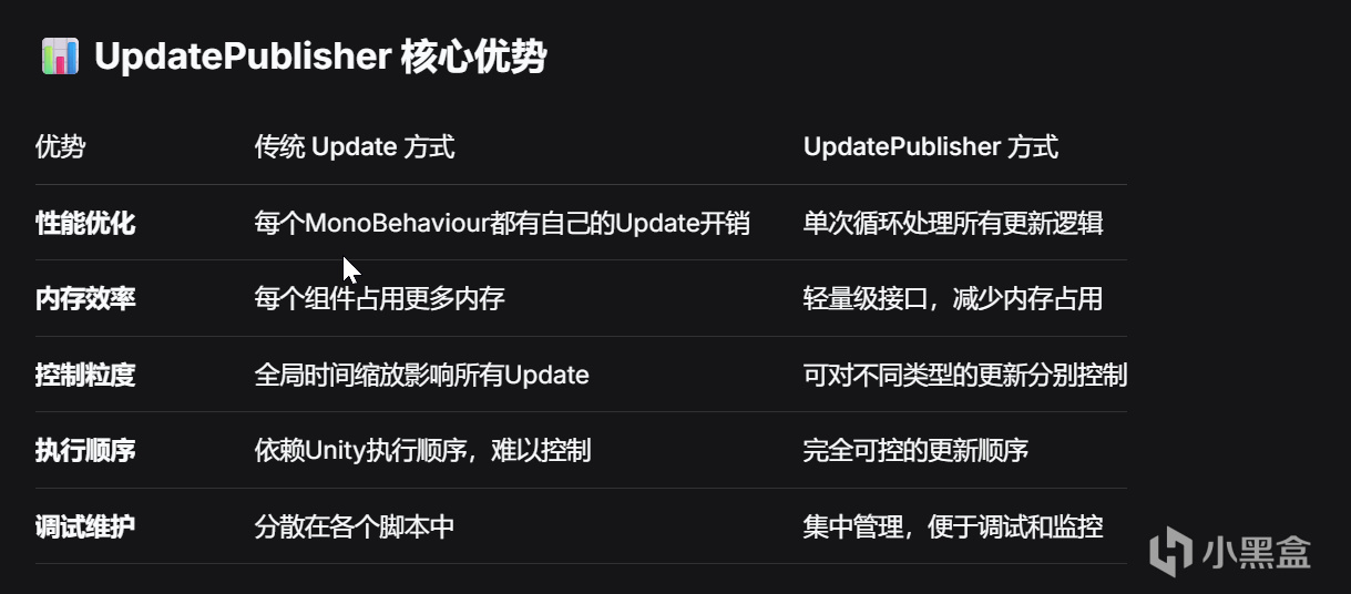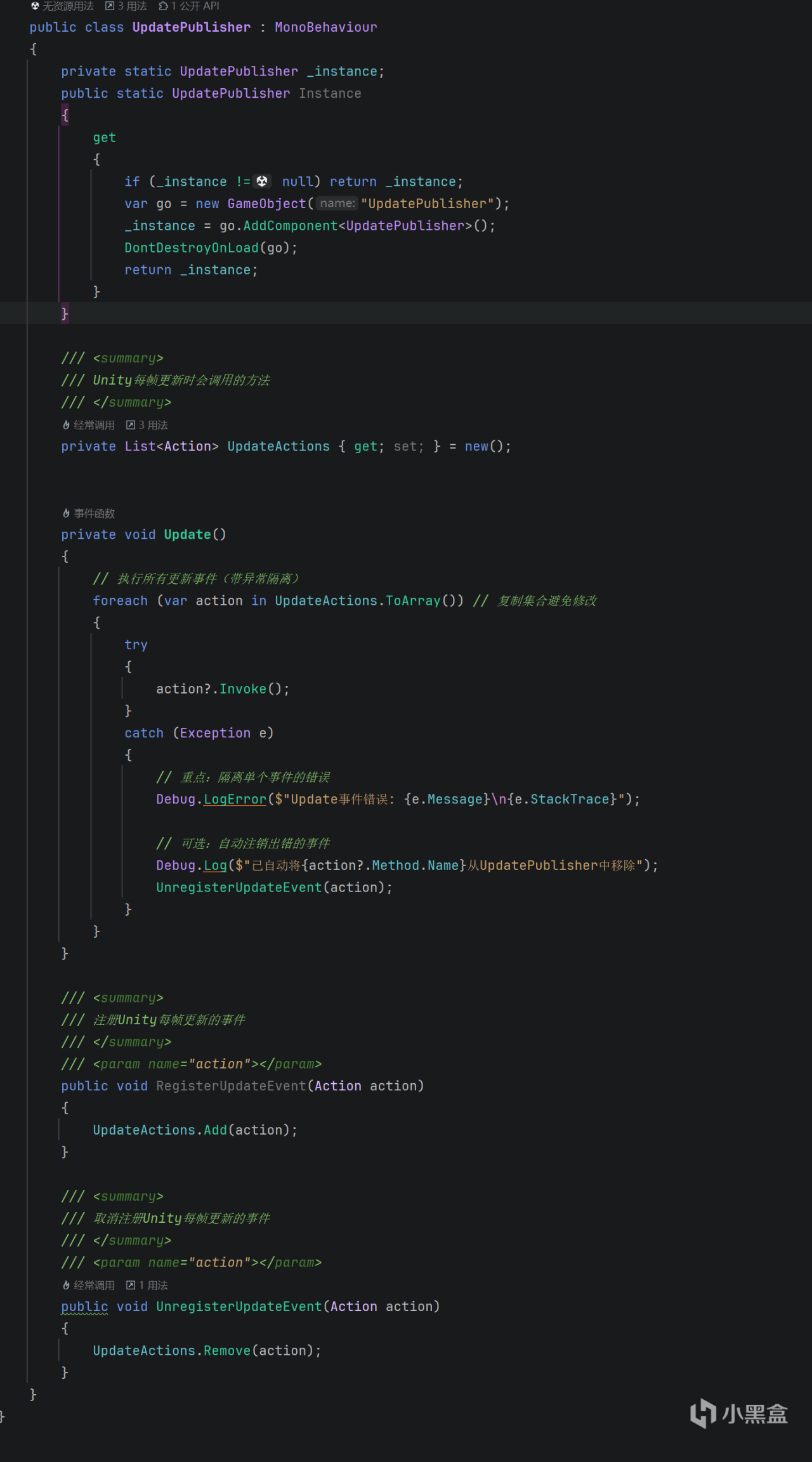 欸,你别说,发明UpdatePublisher的人真是天才!假设有100个脚本,如果不使用自身的Update,而是全部调用1个脚本的Update呢?100个脚本把各自更新所需要的代码,以委托Delegate或者事件Event的方式注入到同1个脚本的Update方法里,让这个单独的Update每帧都执行这100个脚本的更新代码,是不是就减少了99次隐形的消耗?