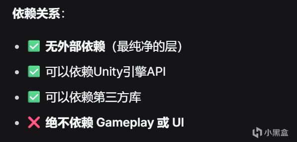 Core层的代码,除了自身、第三方库、Unity底层的API外,不应当再依赖项目里的其他代码。就好比你家里这个工具间,把它完整拆出来放到别人家,别人也是可以轻松使用的。