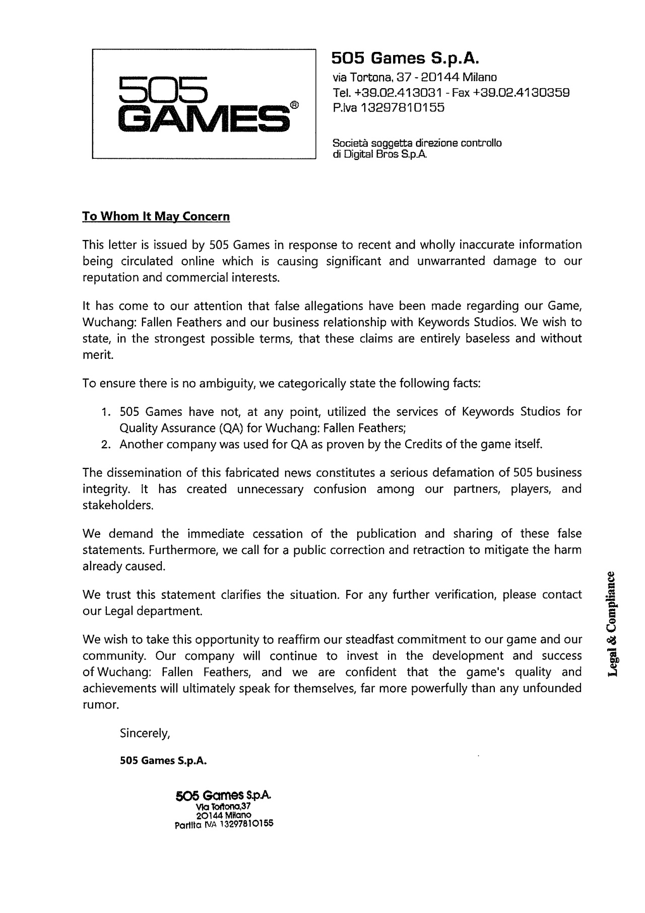 今天晚上,505 Games发布正式声明以回应近期互联网上流传的不实消息。
