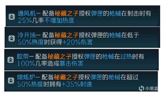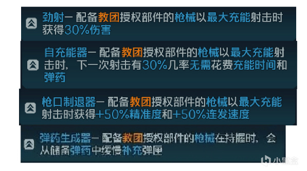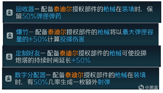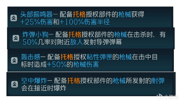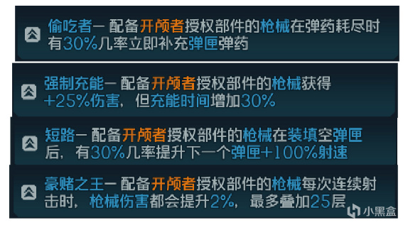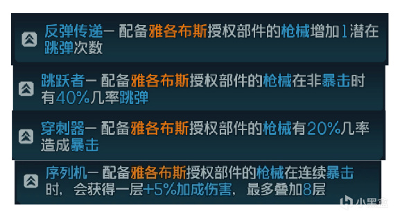 以黑火药为内核的雅各布斯武器,最大亮点是暴击时子弹会弹射至附近敌人造成伤害。