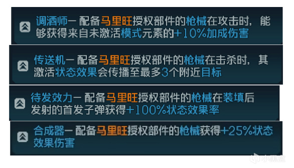 马里旺的枪械以元素伤害为核心,通过焚烧、冰冻、电击等元素属性削弱敌人,适合策略性战斗玩家。