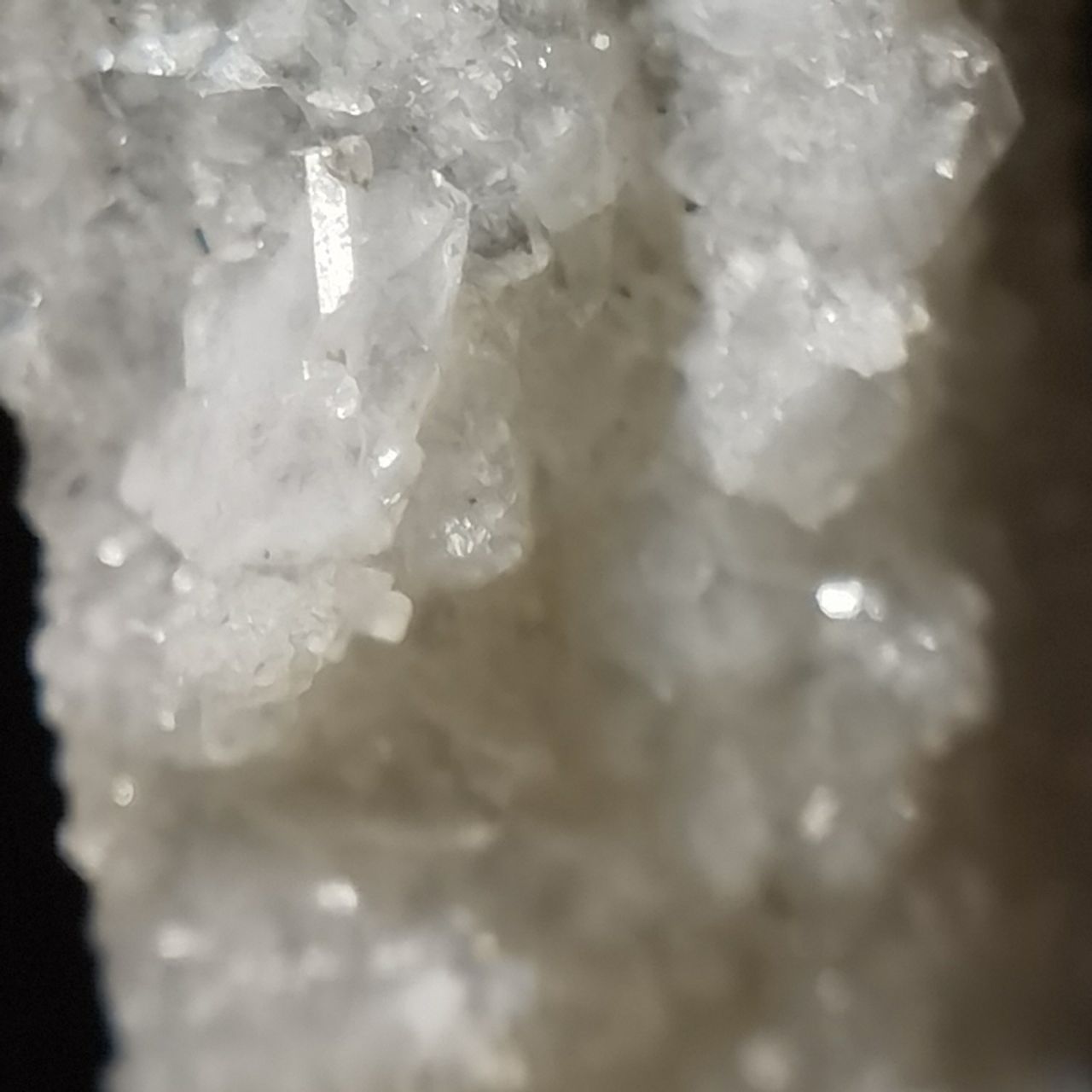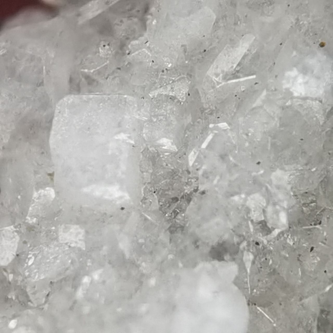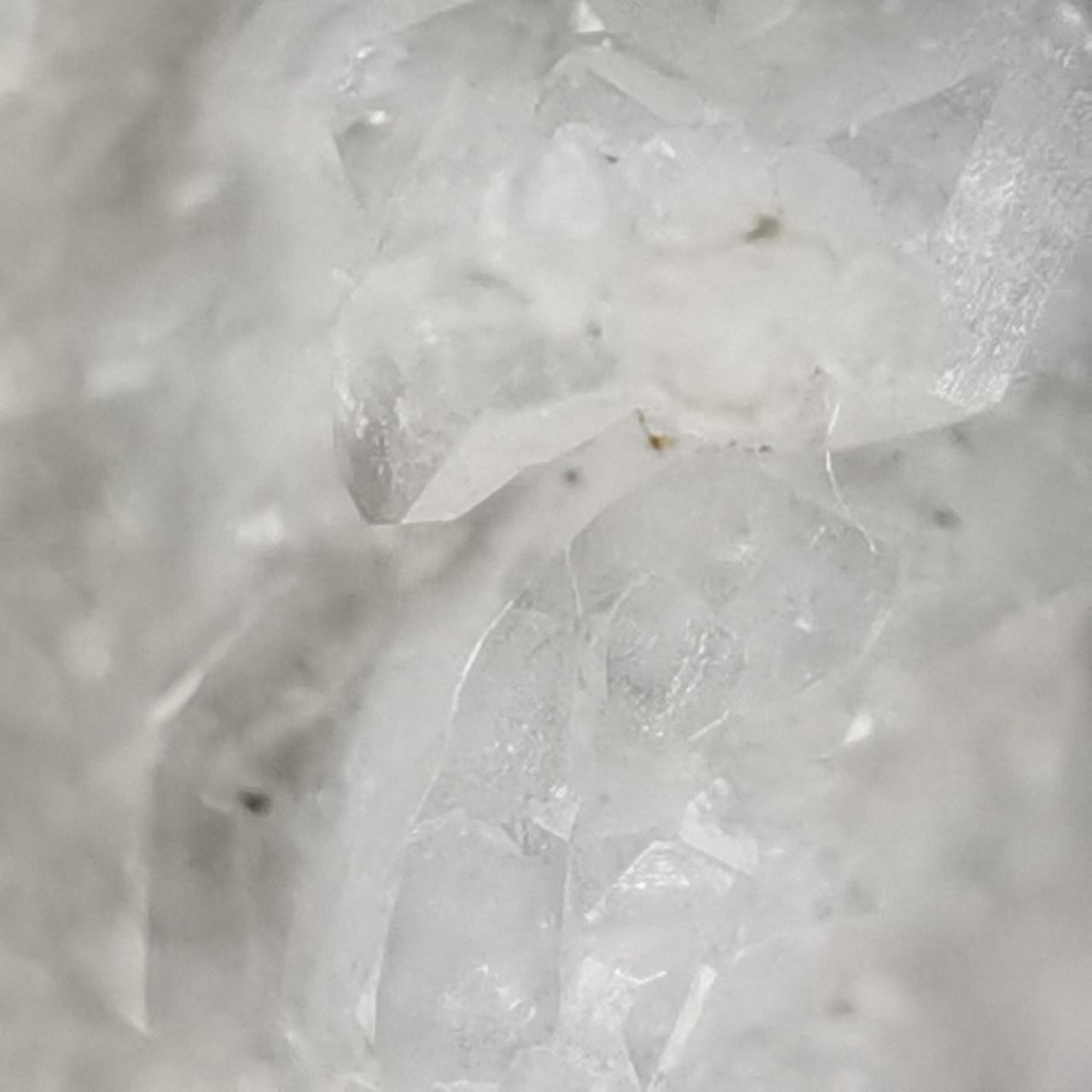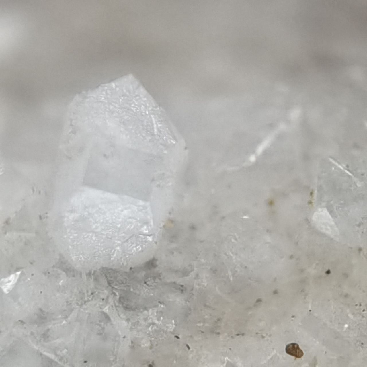 本块标本的白铅矿看不出晶体,铅矾晶体较小分布在整块底岩上,高倍微距可以看到一些晶体。破山的白铅底岩许多都是穿插状样式,而这块只是单独的一根晶体,我感觉一般般,因此卖出
