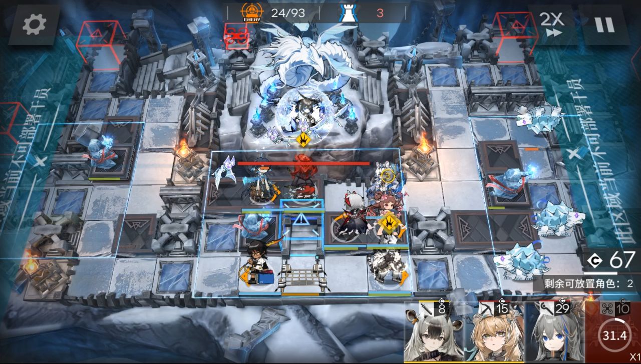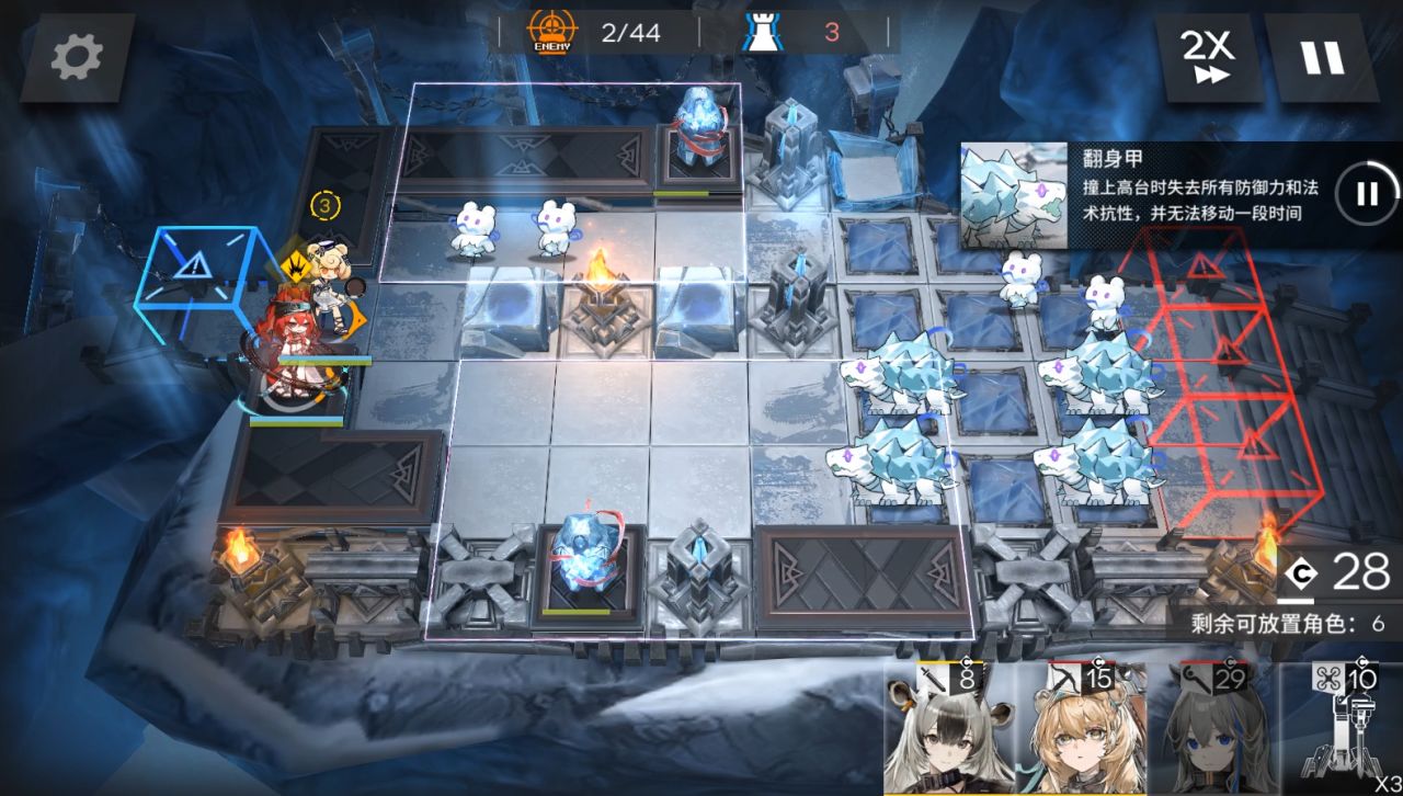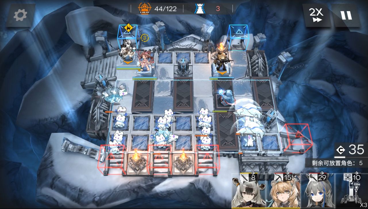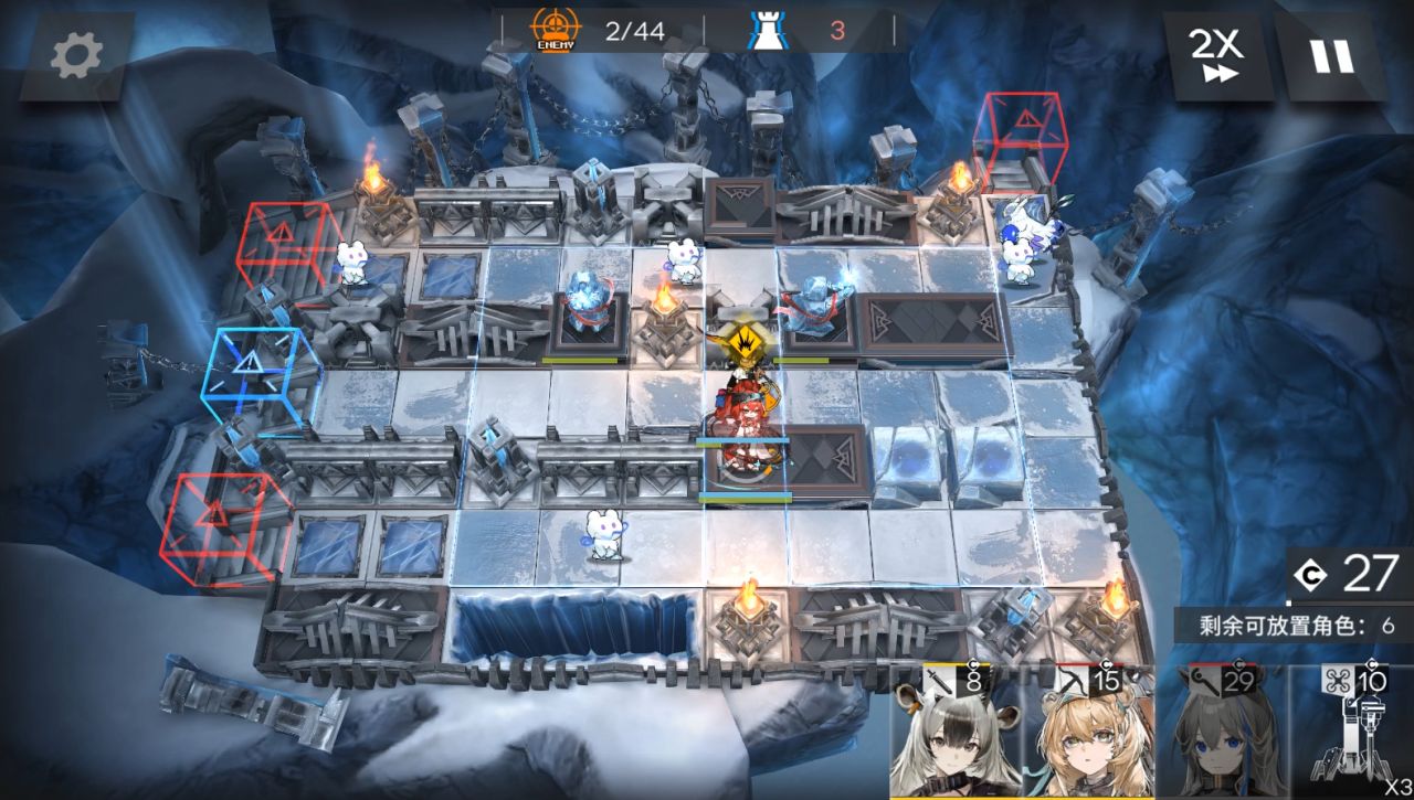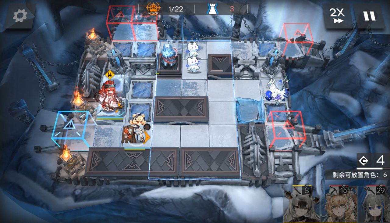 装置带第二个。1阶段,放棘刺朝左,大姨朝上,流明朝右。然后地图往右边移动,放小羊朝右,山。(5人在上图左边一格,这是被雪崩往右边推了)。来到boss第二管血,可以攻击后放EW朝上,使用装置。秒掉boss结束。