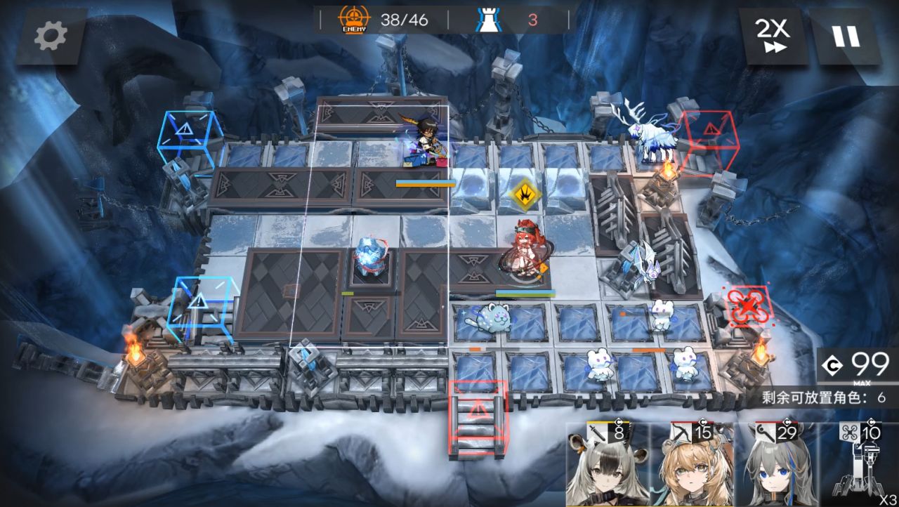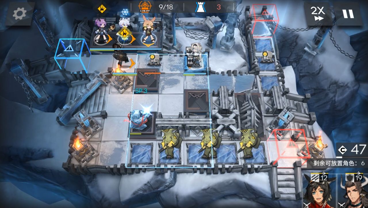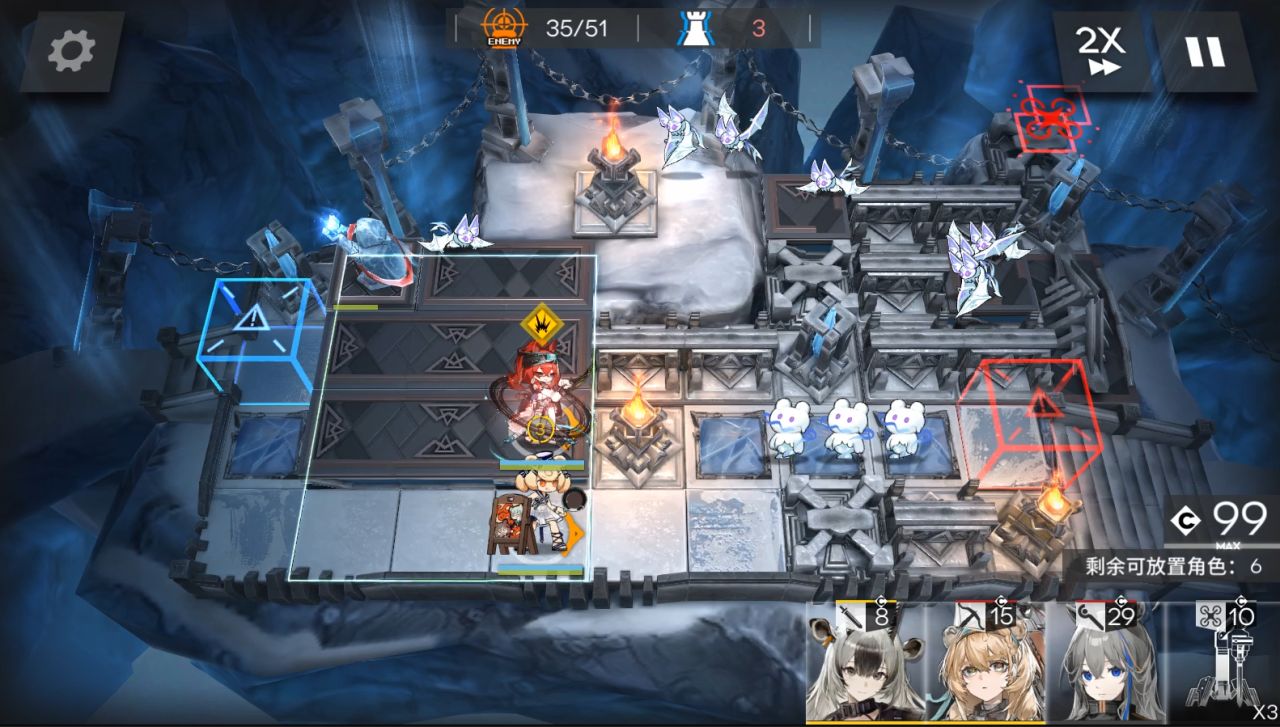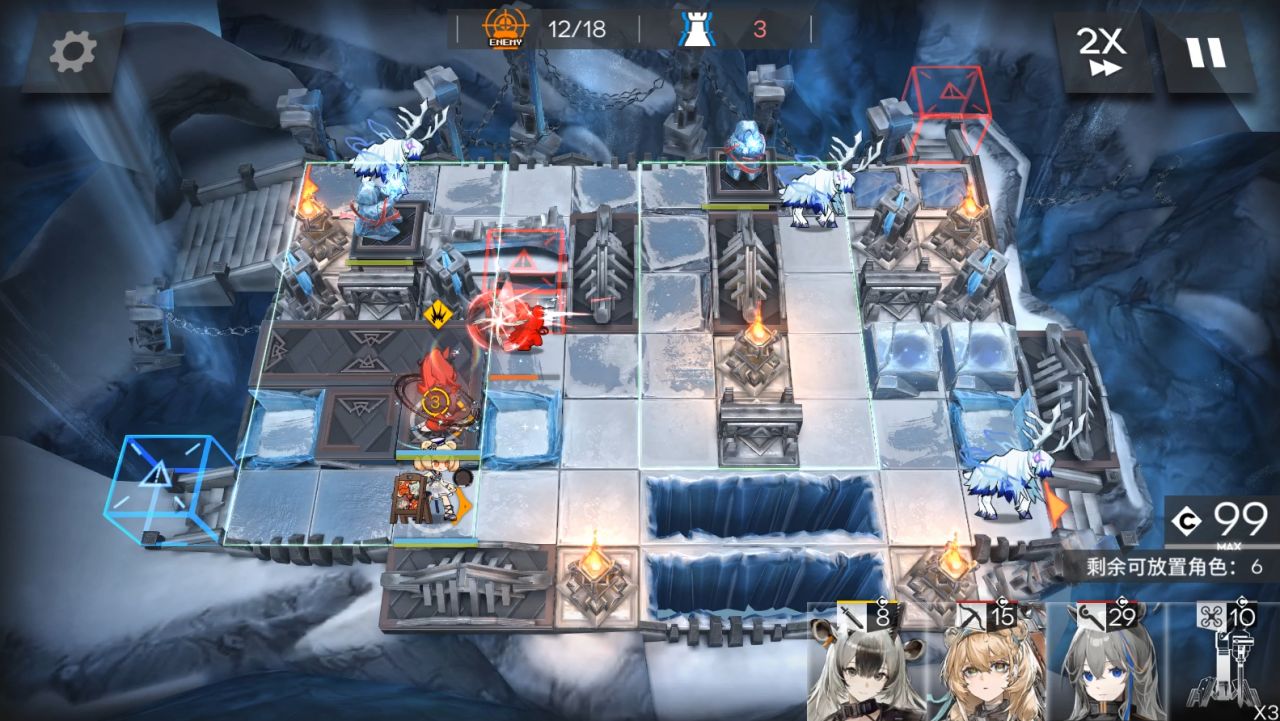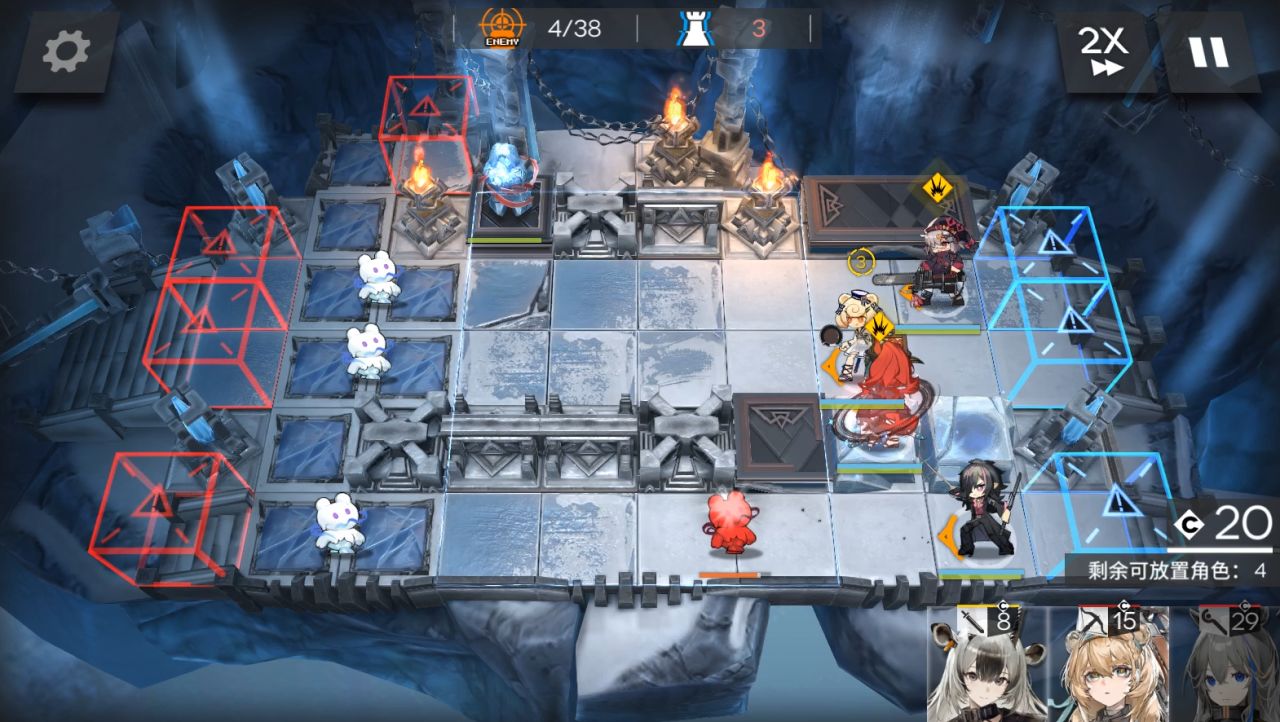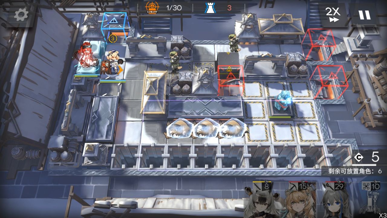 装置带第二个。1阶段,放棘刺朝左,大姨朝上,流明朝右。然后地图往右边移动,放小羊朝右,山。(5人在上图左边一格,这是被雪崩往右边推了)。来到boss第二管血,可以攻击后放EW朝上,使用装置。秒掉boss结束。