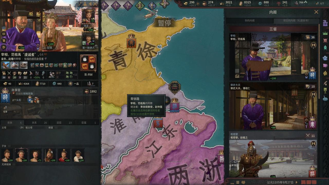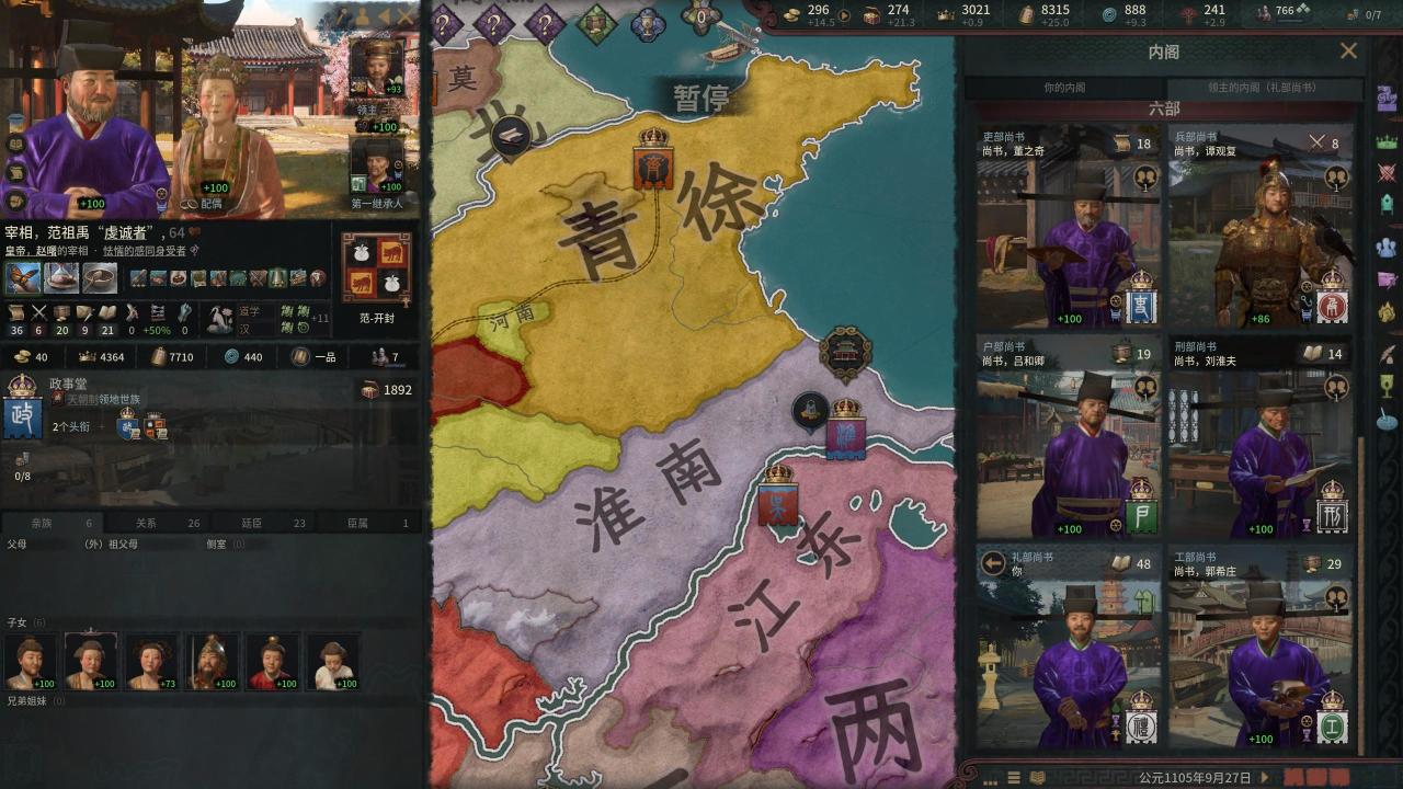 很可惜,游戏里哪怕做到御史大夫,自己的内阁成员还是经典的外交、财政、管理、间谍、军事五总管(外加配偶)。我希望今后的三省六部主官都能有自己的属官属吏,而不是只有冠以“长史”“司马”之名的换皮中世纪欧洲五总管。