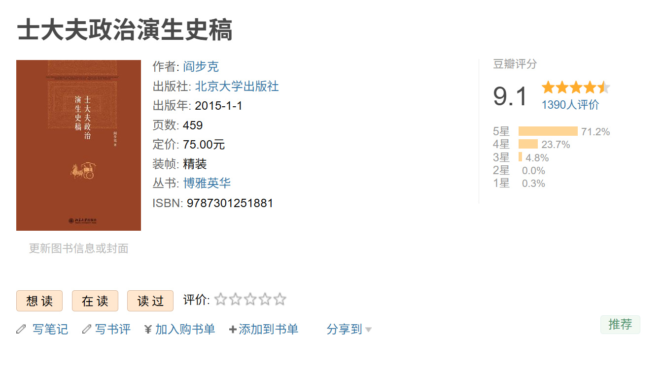 这里的“读过”当然不是指把每一页都逐字逐句读完,过目不忘,信手拈来,而是指我对书的作者和创作背景(所谓“知人论世”)、全篇结构、主要观点等都有整体的感知,对其质量有总体把握,这样才能放心推荐给盒友们。
