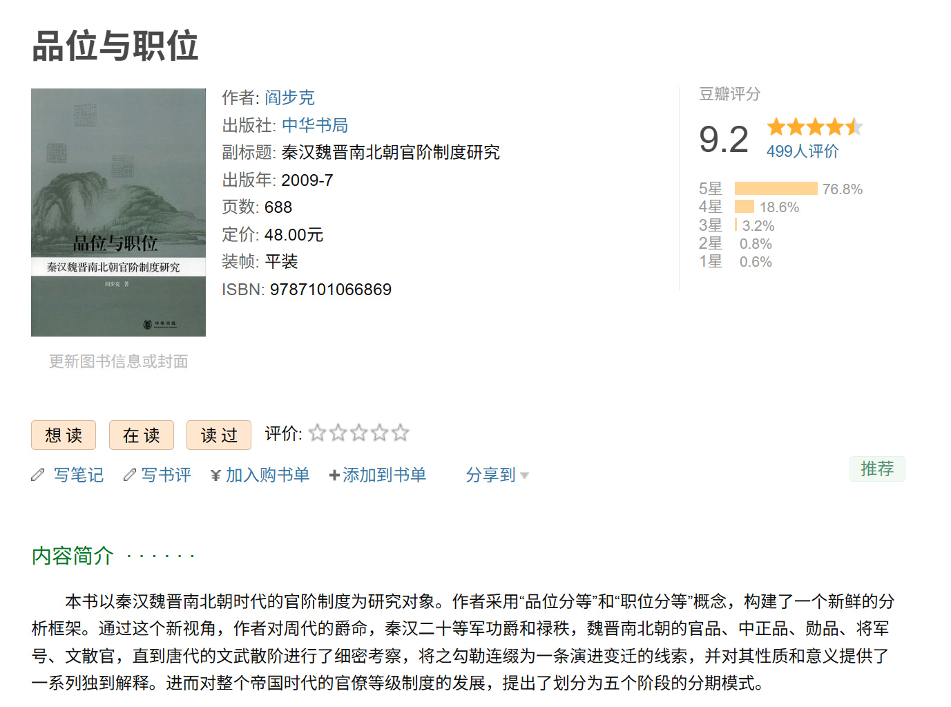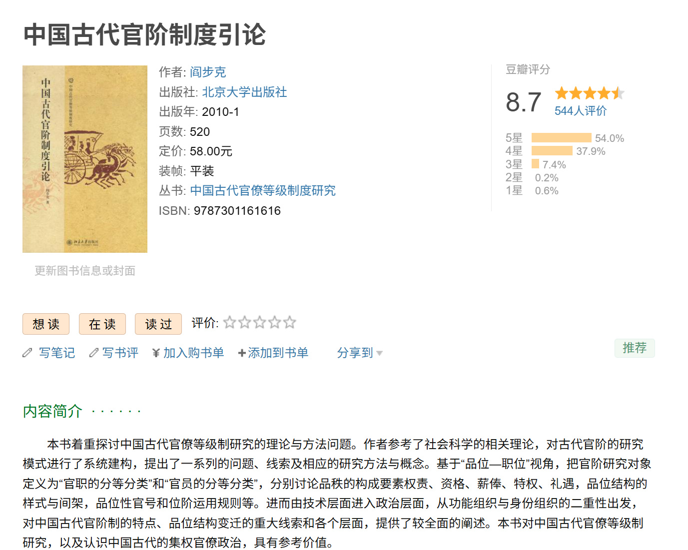 另外,阎书都是大块头。《中国古代官阶制度引论》五百多页,《品位与职位》六百多页,不适合缺乏耐心的朋友。配合阎老师的网课阅读,风味更佳。