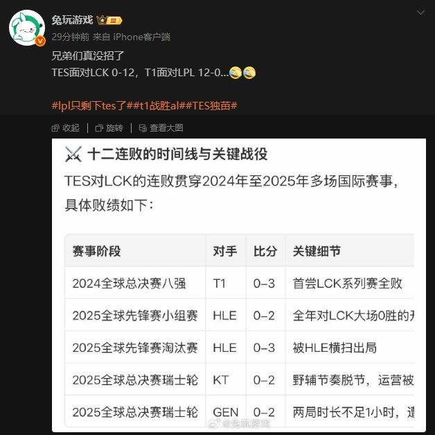 12場敗績是沉重的枷鎖,也是奮起的座標。當Kanavi的打野節奏對上T1的運營體系,當TES的團戰激情碰撞T1的老道經驗,這場比賽早已超越勝負本身。若能贏下,TES將改寫LPL的抗韓歷史,成爲賽區新的英雄;即便失利,這場對決也將爲LPL留下寶貴的抗韓經驗。