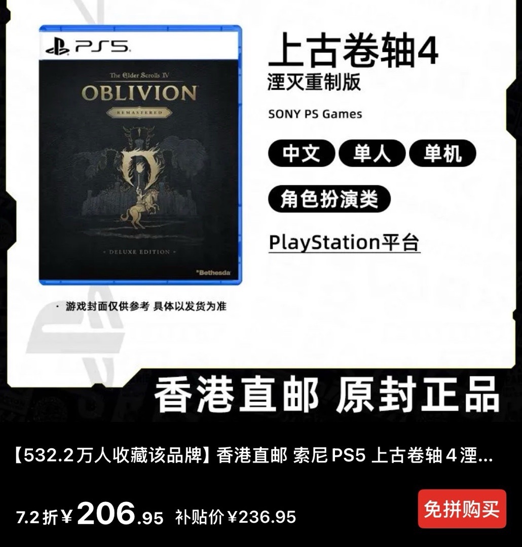 上古卷轴4港版豪华版新史低206.95(仅85券)