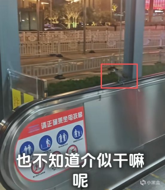 当时路过的人说,这只小鸟一点都不怕生,先是蹦跶着站上上行的扶手,爪子紧紧勾住上面的纹路,跟着扶手慢慢往上走。