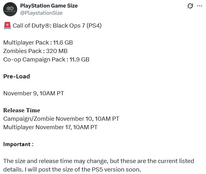 预购数字版的玩家在预载《使命召唤:黑色行动7》时将自动安装最新更新,但临近2025年11月10日战役/僵尸模式解锁日及2025年11月17日多人模式上线时可能推送额外更新。购买实体版的玩家则可能需要下载更新内容。PS4版本合作战役包、僵尸模式包与多人游戏包总容量(23.82 GB)不足《使命召唤:黑色行动6》战役包1、战役包2与多人游戏包总容量(50.231 GB)的一半。
