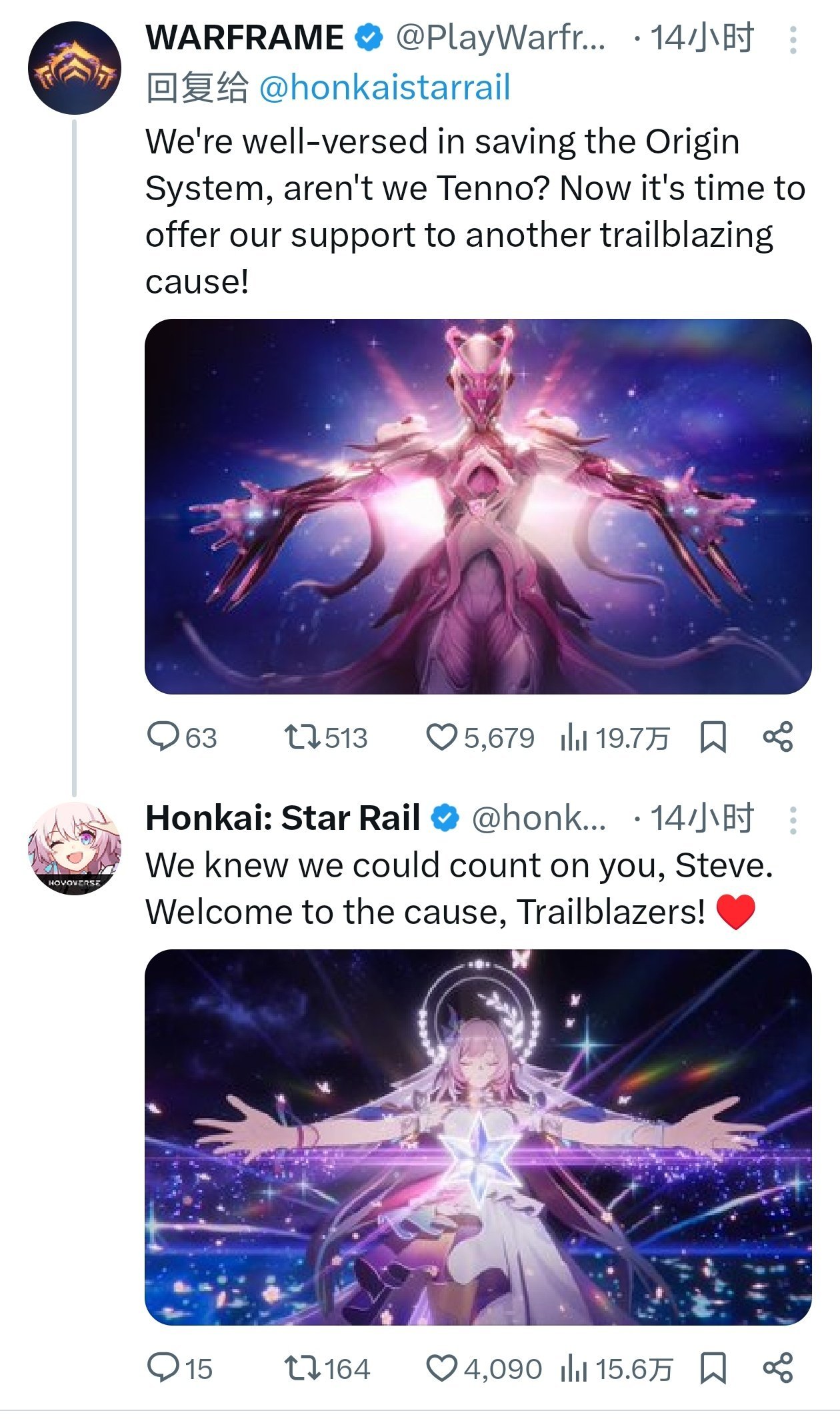 紧随其后,《Warframe》以科幻风加入战局:“我们精通拯救Origin System,不是吗Tenno?现在是时候支持另一个开拓事业了!”帖子展示了一位粉色能量充盈的Warframe战士,散发着星际光芒。《星铁》回复道:“我们知道能指望你,Steve。欢迎加入事业,Trailblazers!❤”Warframe的加入,不仅为活动注入硬核射击元素,还让粉丝们脑补出一场“虚空与星轨”的史诗对决。