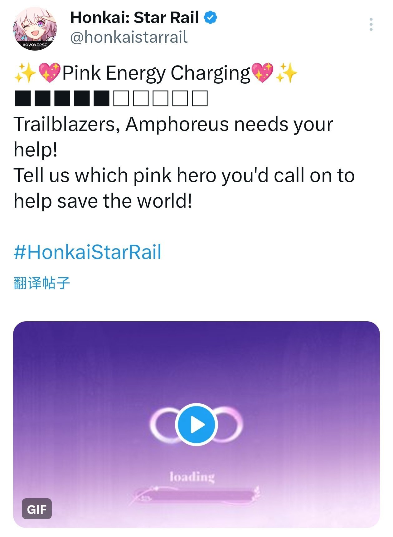活动伊始,《星铁》官方在X平台(前Twitter)发帖,以“Trailblazers,Amphoreus needs your help!”为号召,配以粉色能量条的动态GIF,呼吁玩家分享“哪个粉色英雄能助你一臂之力”。帖子一经发布,便收获数千点赞与转发,粉色主题的视觉设计让整个互动充满活力与趣味。官方巧妙地将游戏内“翁法罗斯”世界的危机与现实粉丝文化相结合,鼓励跨游戏联动,瞬间点燃了玩家们的热情。