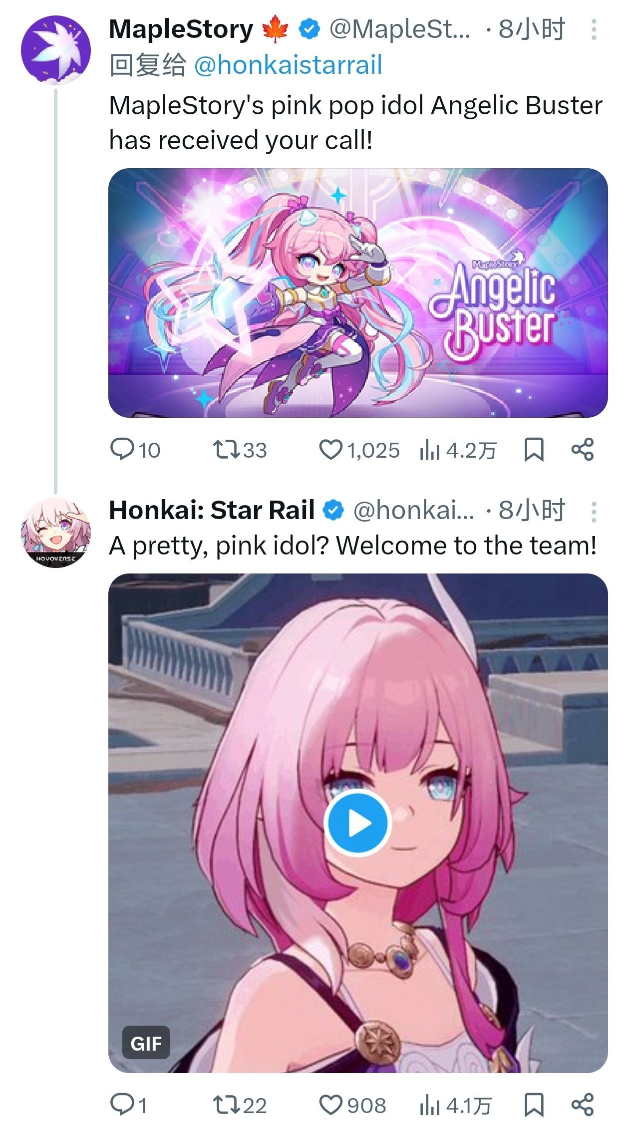 《MapleStory》则带来可爱风的粉色偶像——Angelic Buster。她以“MapleStory的粉色流行偶像已接下你的呼唤!”为口号,登场时伴随着闪耀的舞台效果和魔法少女变身动画。《星铁》热情欢迎:“一个漂亮的粉色偶像?欢迎加入团队!”这一回应配以小昔涟的动态GIF,粉丝直呼“太萌了,瞬间满能量”。