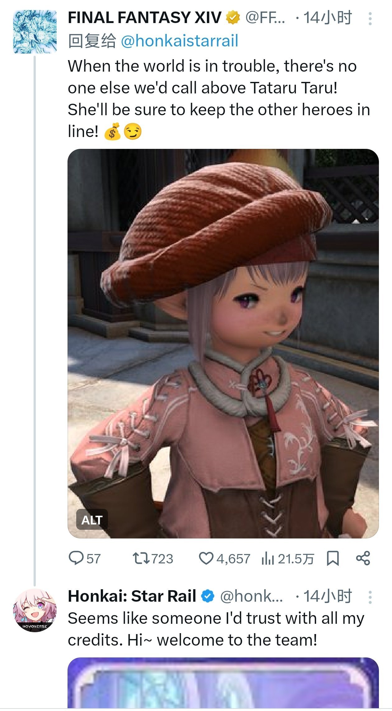 响应号召的游戏阵容堪称豪华。首先是《最终幻想XIV》,其官方账号幽默回应:“当世界陷入麻烦时,我们会叫上Tataru Taru!她会确保其他英雄排好队(附带表情)。”配图中,粉色小巧的Tataru手持账本,俏皮地“管理”英雄队伍,完美诠释了游戏中她的“财务担当”角色。《星铁》官方迅速回帖:“看起来像是我会把所有信用点都托付的人。嗨——欢迎加入队伍!”这一互动让FFXIV粉丝与星铁玩家瞬间“组队”。
