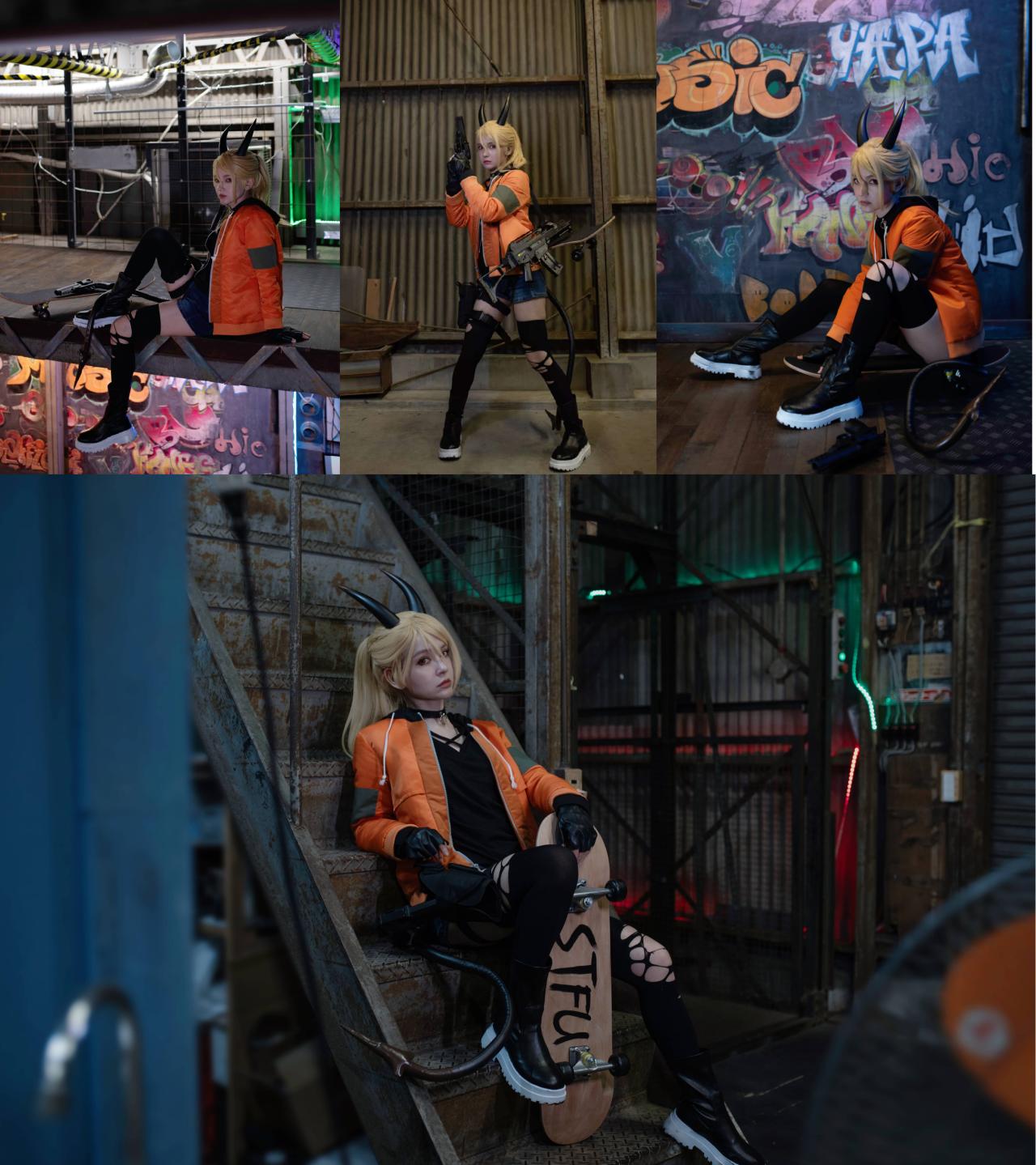 长着恶魔角、尾巴的金发少女,穿着黄色皮衣破损黑丝,用手枪滑板猎杀恶魔。这位从孤儿院逃出的少女,看似弱小无助,实则一枪一个小恶魔(性转毁灭战士)。coser扮演角色出自《孤女困魇》,这是一款由俄罗斯制作人独立开发5年的动作射击游戏。