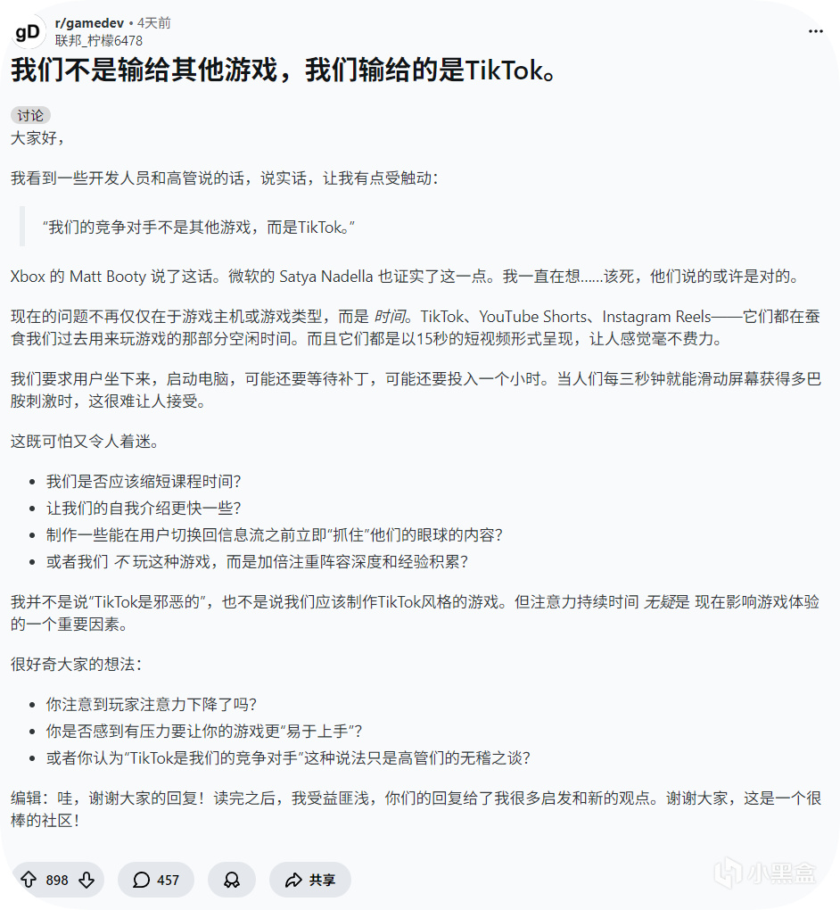 近日,在老外的Reddit社区有一篇火热的帖子,叫“我们不是输给其他游戏,我们输给的是Tiktok”非常火热,好多老外游戏开发者都在热议。