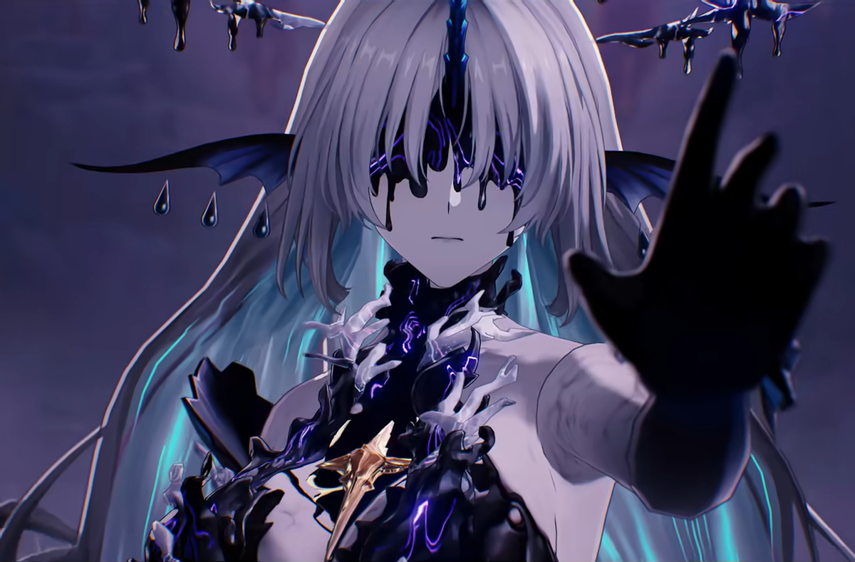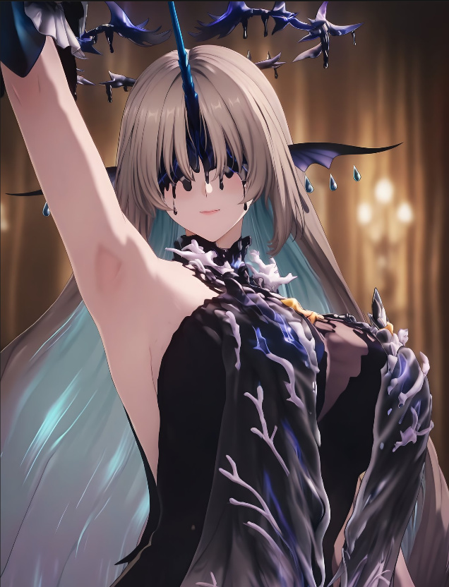 全身被黑化,聖潔被剝奪,BUFF疊加到最後,全部聚集在鳴式臉上那黑潮一樣湧動的液體眼罩上,像一層流動的蠟覆蓋雙眼,那流到臉上的黑潮如同發誓一生獻給正義卻戰敗只能眼睜睜看着自己身體被魔王拿來做壞事的女騎士最後流下的眼淚,縈繞這悲傷與破碎的同時,眼罩自帶的神祕感又讓人對後面的那雙美眸充滿想象,看不到眼睛,還會把我們的注意力集中在利維亞坦微微輕顫的雙脣以及胸前的波濤上,那黑潮的黏糊糊的趴在上面卻仍然在不斷的律動着,只要看到這裏,目光必定會被那巨大寶箱中間擠壓的聲核驚得移不開雙眼,全身黑紫色中耀眼的一點金色屬於是物理意義上的點睛之筆,這種完美聖女加黑潮要素的反轉如同聖女貞德變成黑貞,更有一番韻味啊。