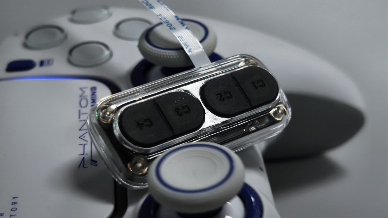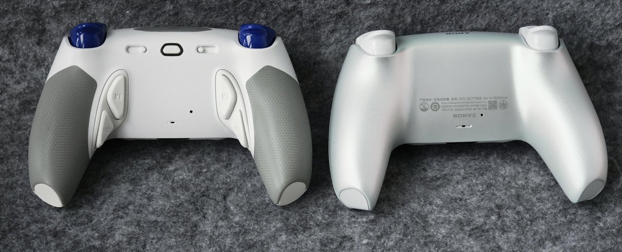 OK那么下面让我们将目光移到手柄的背部,大家很明显就能察觉到原版的背面啥都没有,光秃秃的。而幻刃的背部却满满当当的,4个背键+二段式切换开关已经一个存储映射按键