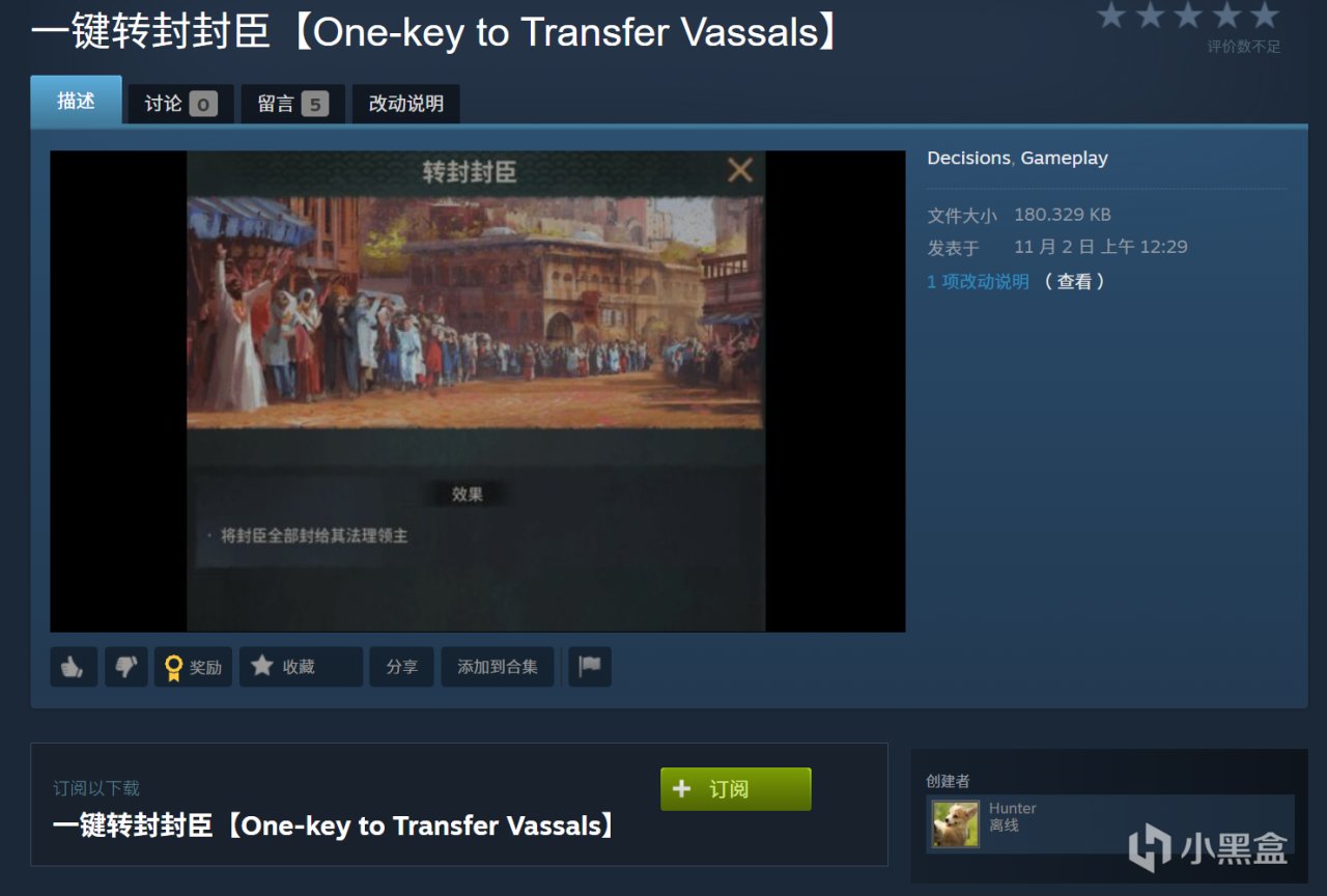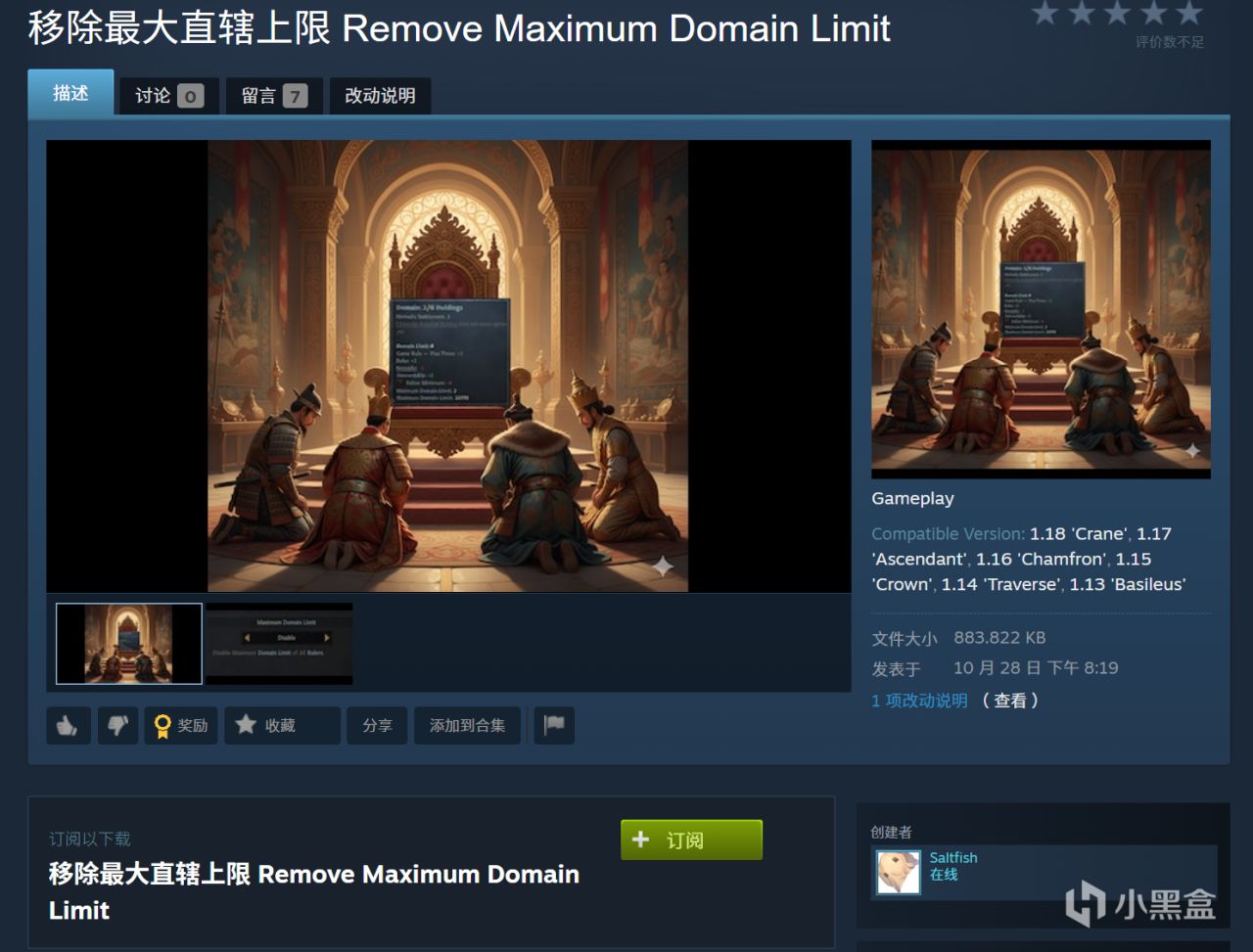 此模组增加了无视最大直辖上限和最大封臣上限的游戏规则。相比其他通过更改游牧法律等方法,兼容性更好且不需要维护。