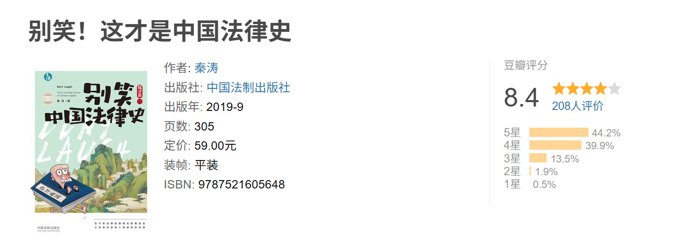 全列举别人推荐的书也太偷懒了,所以我也推一本给大家——《别笑!这才是中国法律史》。和上一期提到的《中国法制史》教材一样,这本也是我在考研期间看的书(这样复试时老师们问我除了教材外还看过哪些书就不至于答不上来)。