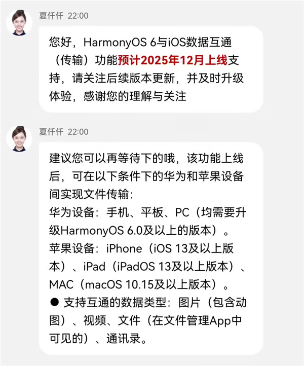 据华为官方客服介绍,HarmonyOS 6与iOS数据互通(传输)功能预计2025年12月正式上线支持。